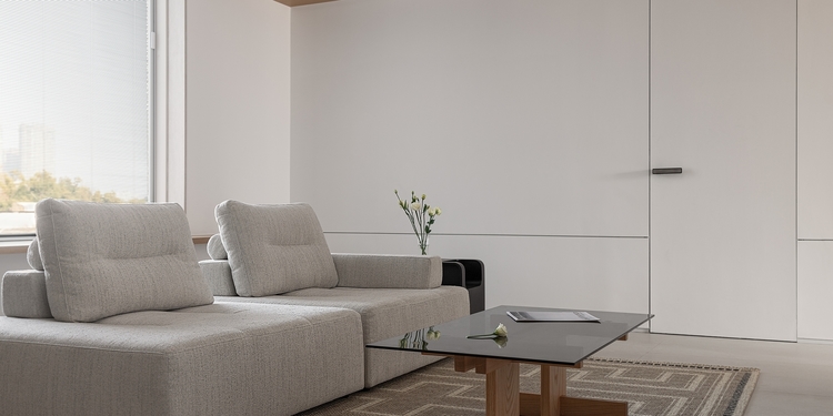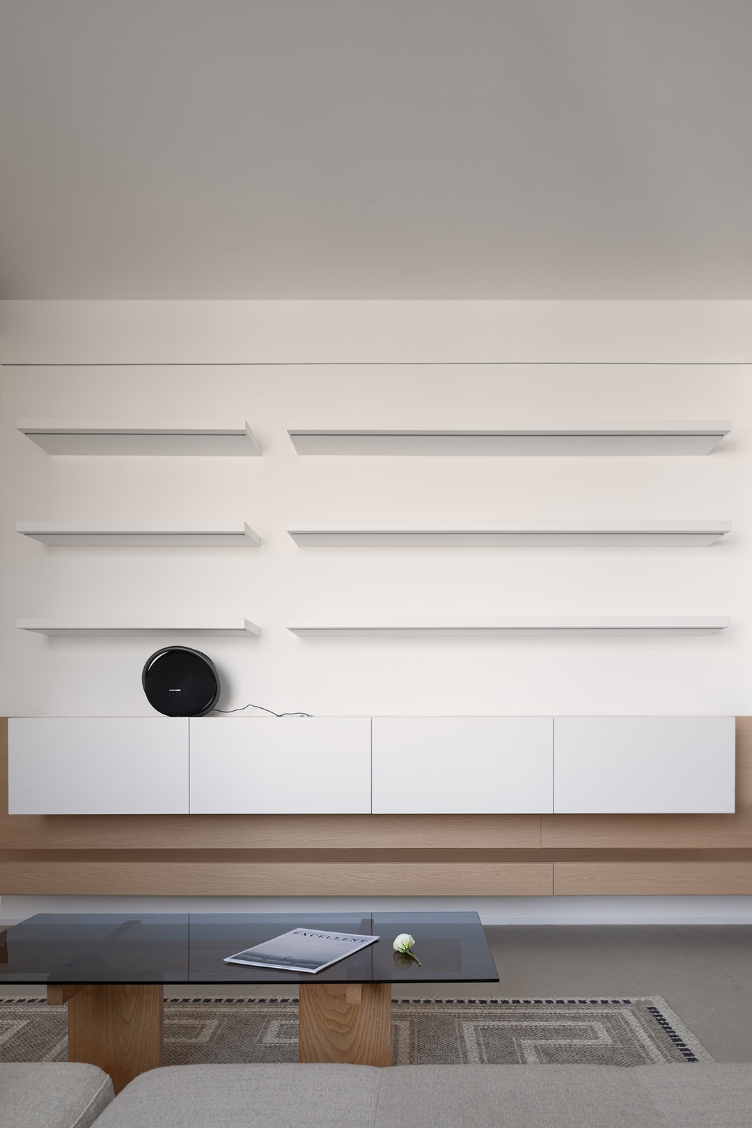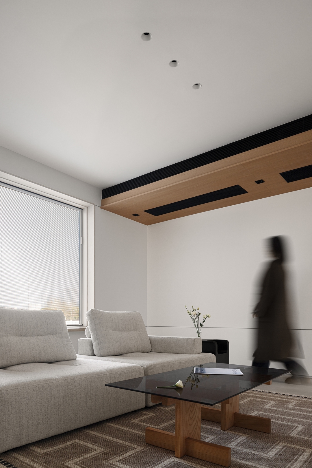 以现代极简为基调,原始结构承重墙较多,布局上保留了三室两卫的框架,同时将客厅改造为“去客厅化”的共享书房。大横厅格局搭配整墙白色书架,取代传统电视背景墙,去客厅化,营造通透敞亮的视觉感。白色墙面与浅木饰面构成主色调,局部穿插哑光黑金属细节,整体氛围清爽舒缓。南向主卧与次卧分列走廊两侧,北侧增设独立茶室,满足屋主书香与茶韵并存的生活需求。用现代极简的设计手法,为屋主调和出一个轻松舒缓、温暖明快的居所。