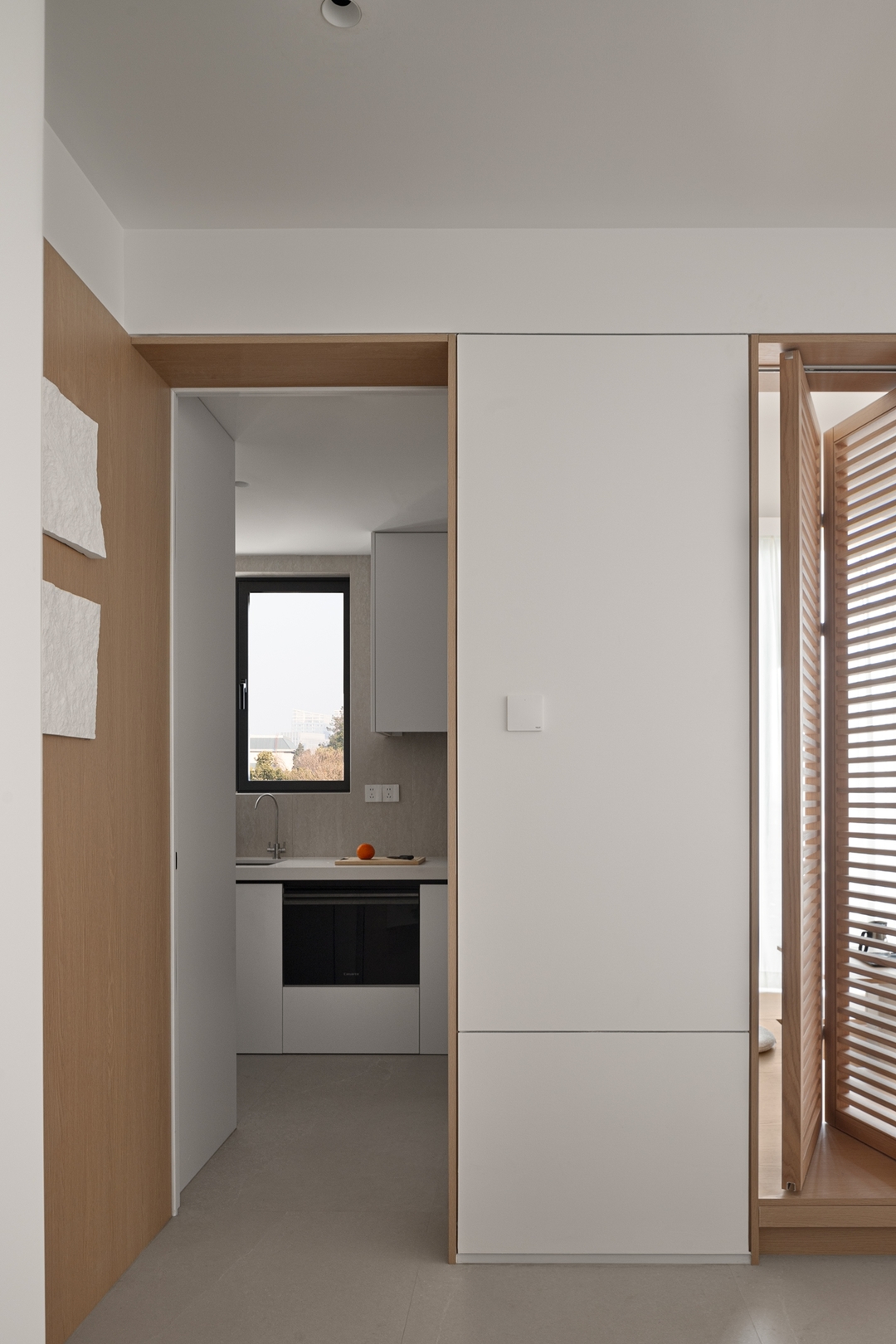 拆除狭窄厨房门洞,延伸护墙板包裹垭口,视觉通透感提升30%,动线流畅无阻。纯白台面与黑框窗格对望,线条利落。晨光斜切而入,掠过中岛,清茶香气与木色门外的疏影悄然相融。瓷光轻闪间,淡冷与温润达成默契——生活至味,就在这刚柔相济的留白里。