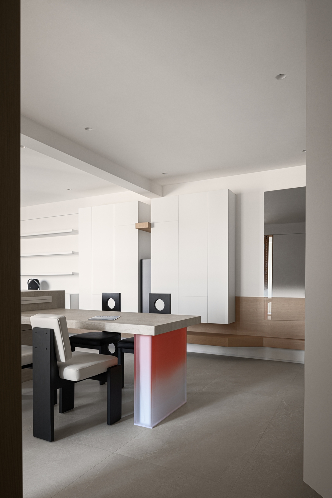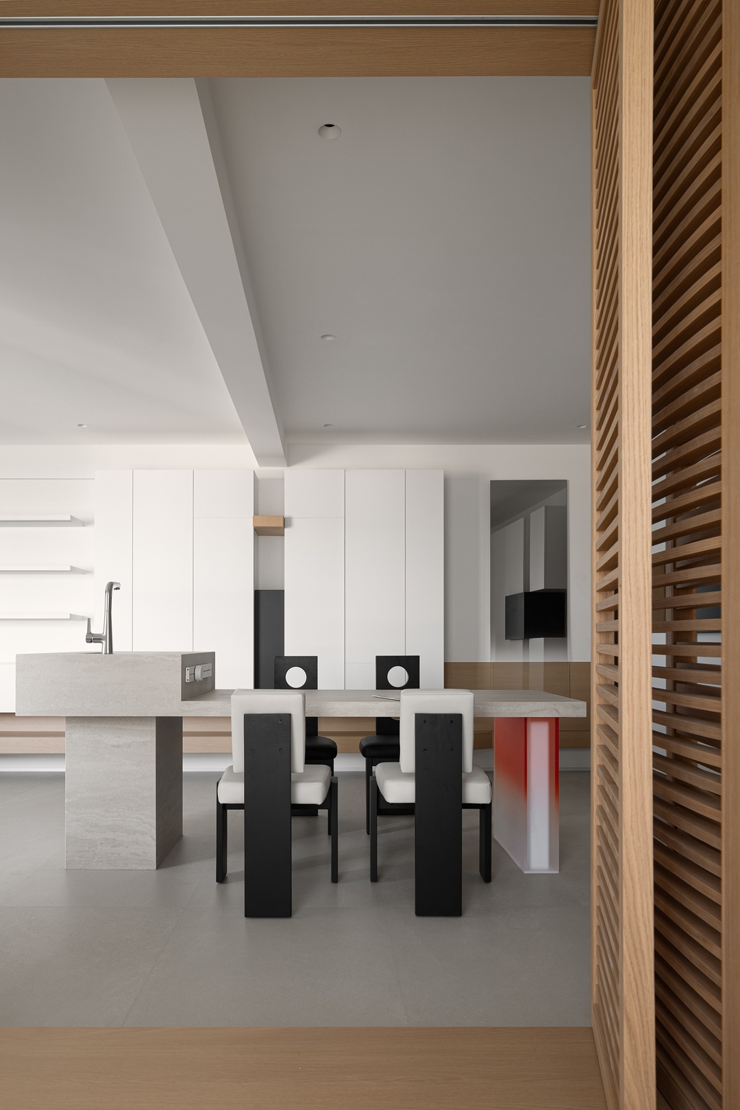 亚克力桌腿如冰透光,暖橘沿边漫溢,似暮色渗入灰纹大理石台面,清冷与温润悄然相融。光晕漫过岛台,掠过木色书架,餐具轻碰的瞬间,细碎光斑跳上书脊,三餐烟火亦染书香,黑椅利落收束,烟火与诗意共生。