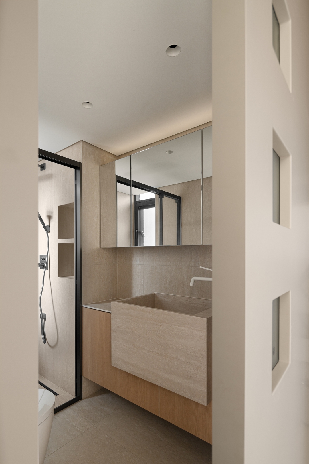 洞石墙砖铺就柔和基底,哑光材质让光线温柔漫射。悬挂式浴室柜轻盈收拢日常,镜面边缘泛着暖光。干湿分离的玻璃隔断透而不露,晨起洗漱时,水汽与光影在素净空间里静静流动。