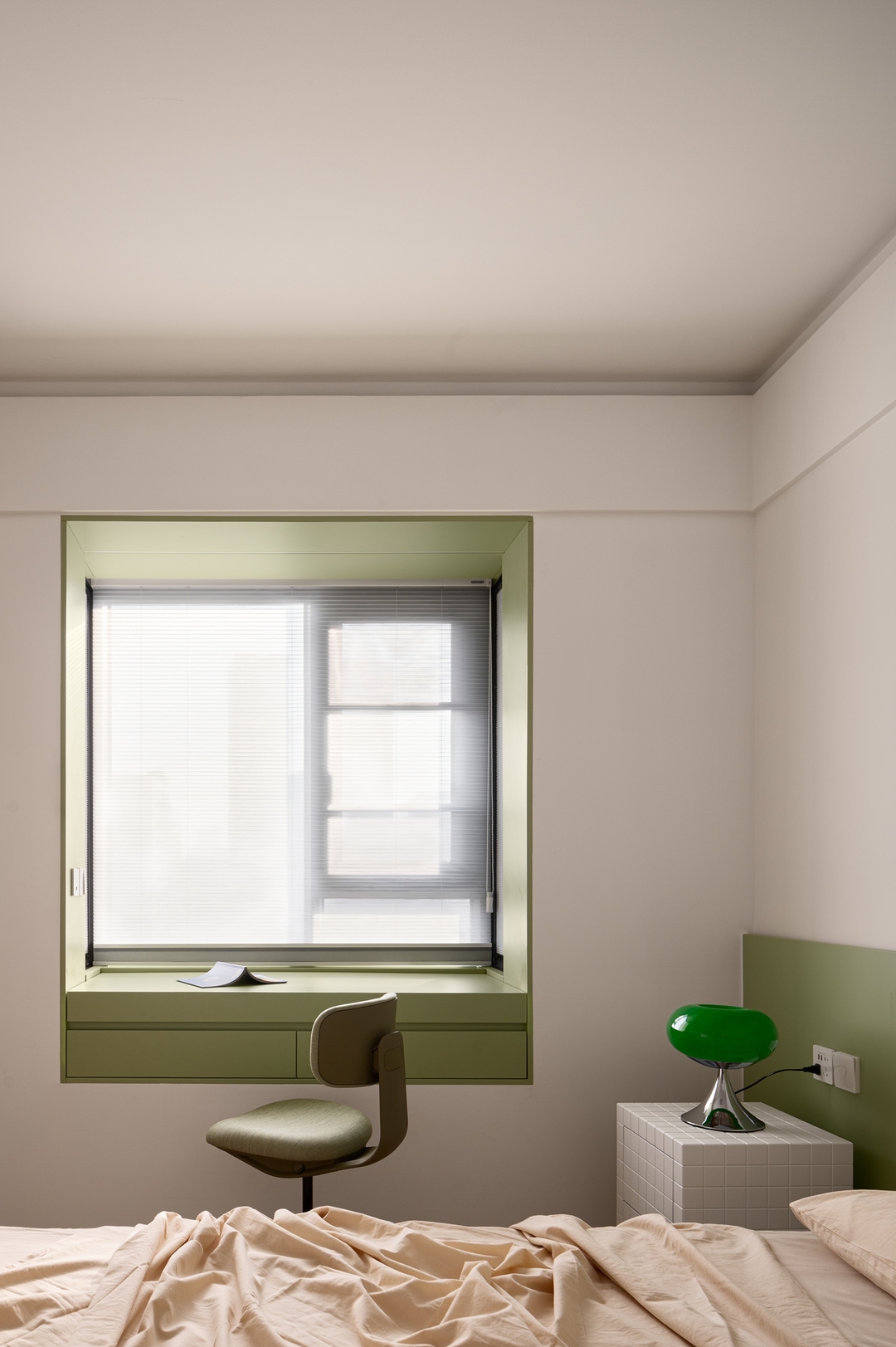 绿墙档配浅黄床头桌,同色系台灯与嫩绿树棂相映,设计师以色块碰撞,简中藏拙,静里生趣。
