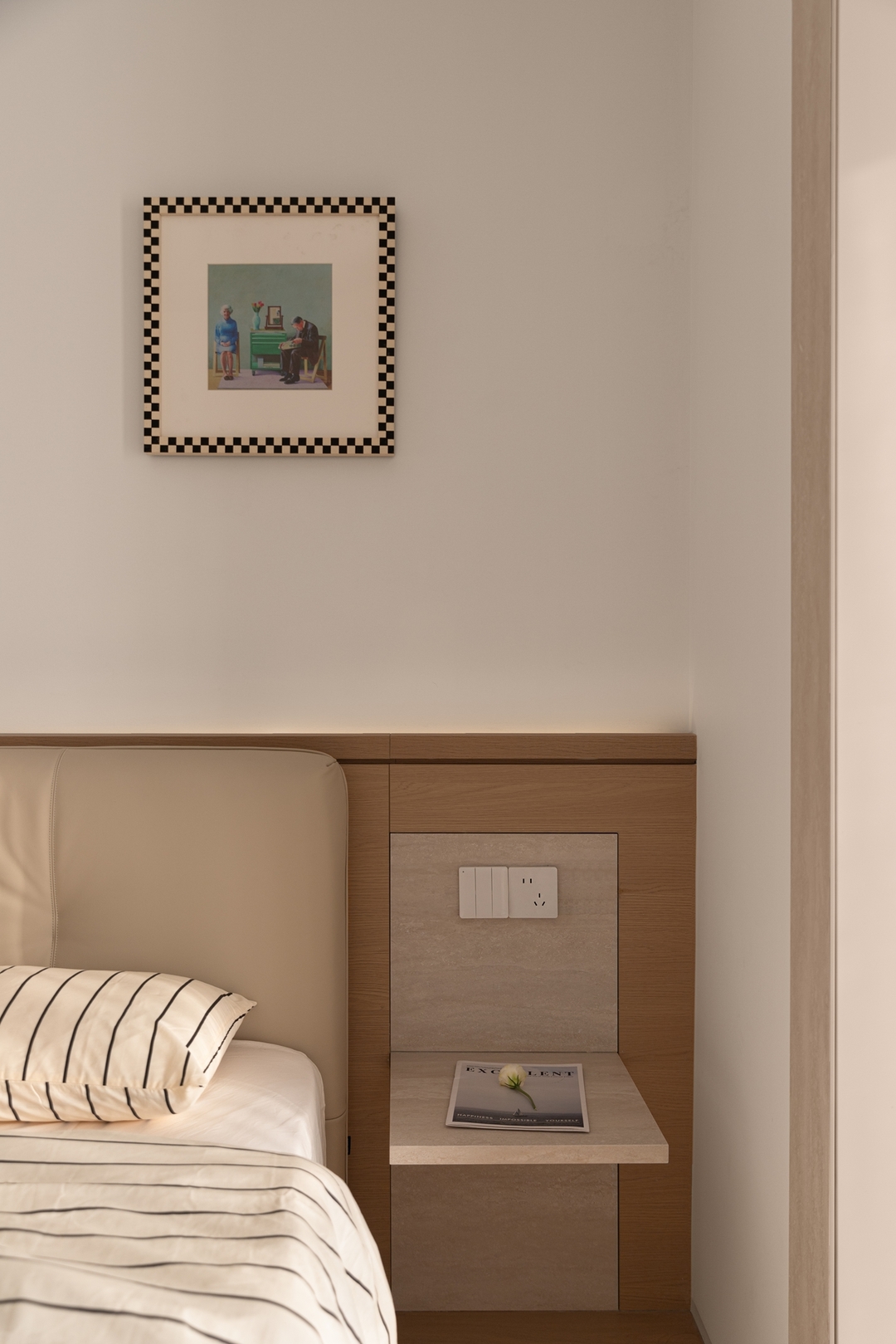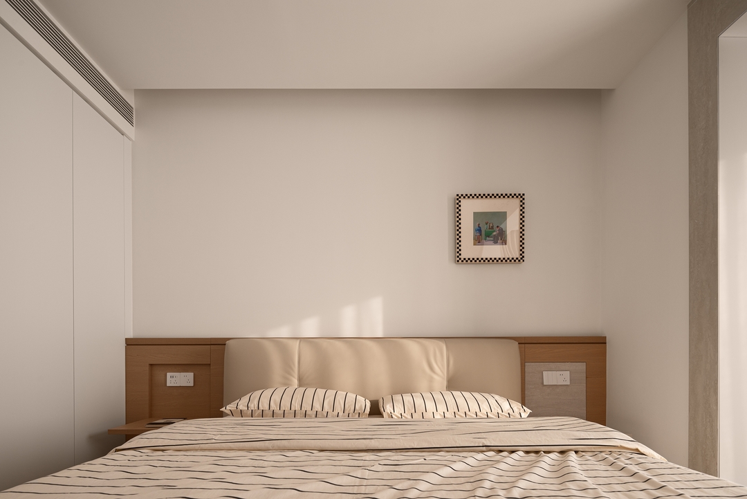 米色带来柔和,黑色线条勾勒现代轮廓,唯一的阳台在主卧,将洗烘&晾晒区放在此处已是最优的安排,暖调空间瞬间有了时尚的呼吸。画框错落悬挂,恰到好处地打破静谧,为温柔注入一丝艺术张力。晨光透过纱帘,将木地板的纹理温柔放大,整个空间在柔和与克制之间,找到了完美的平衡点。