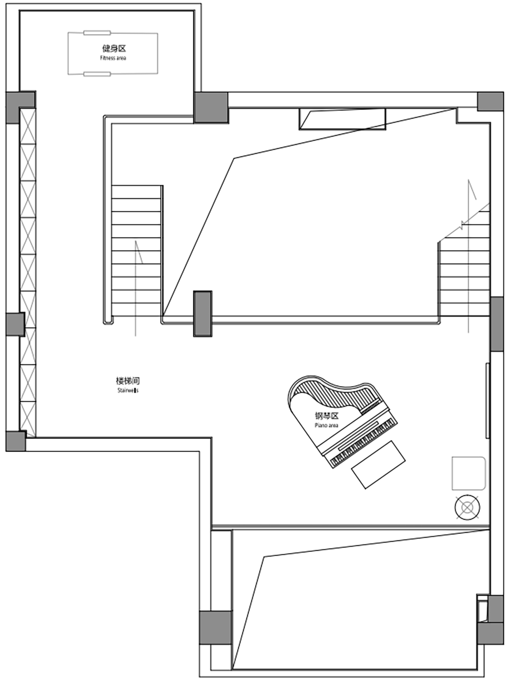 作为地下与地上的中轴层,我们想通过钢琴营造一种仪式感,让每一个音符都成为开启舒适生活的钥匙。黑白相间的键盘,仿佛是连接两个世界的通道,地下的社交主场与地上的安静祥和在乐声中交织、对话。