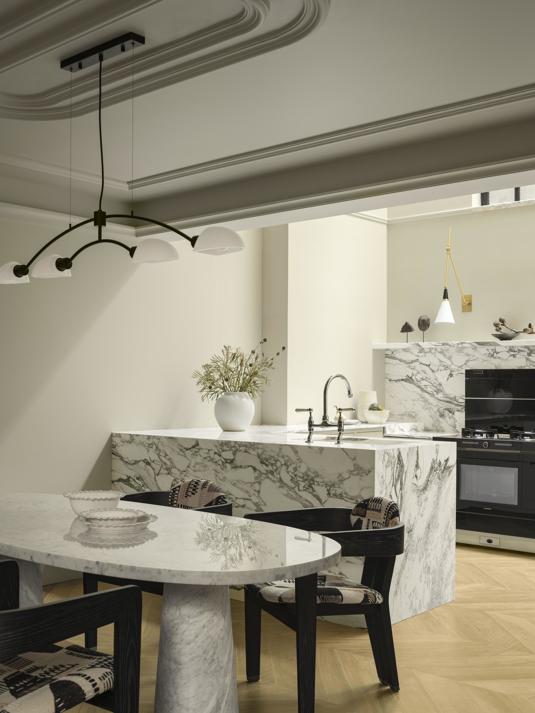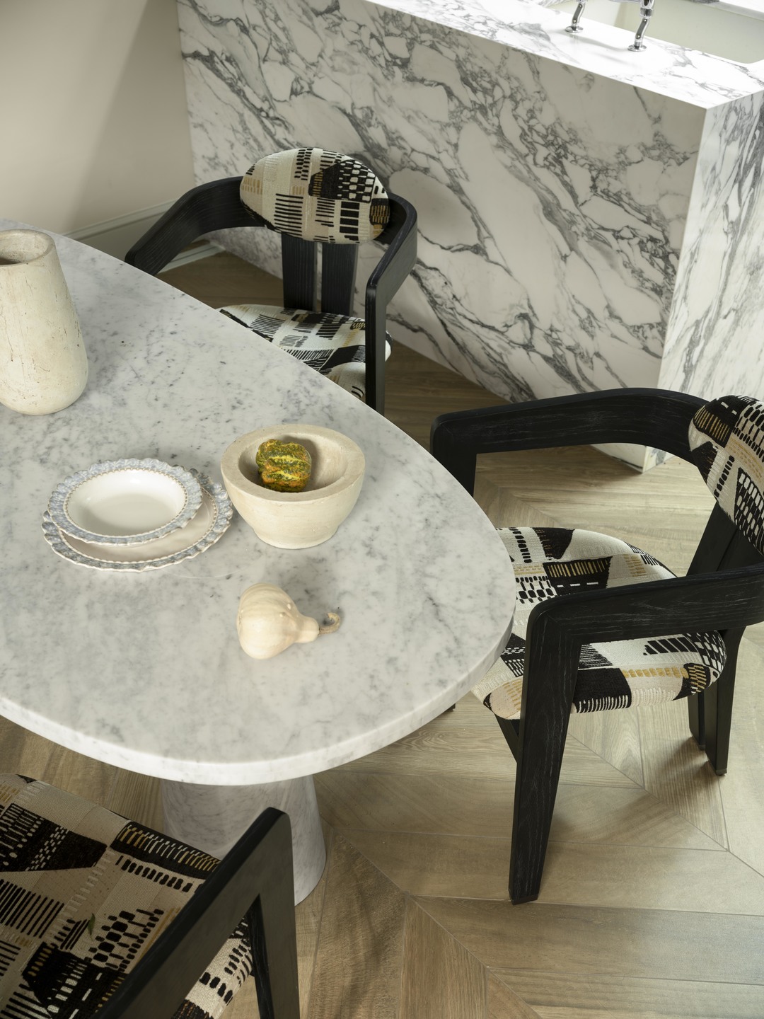 踏入餐厨空间,宝格丽石宛如神秘画卷悠然铺开。在白色基底上,黑色纹理似梦的河流蜿蜒,黑色脉络如岁月的笔触勾勒山川。仿佛一场艺术展览启幕。每一道纹路都藏着故事,在光影交错间低语。
