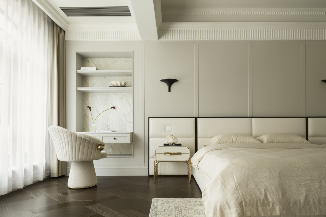 屋主的留学经历,让我们把英伦风带到了主卧。在空间布局上,没有过多冗杂的设计,延续公区风格,摩登法式让空间更有空间感和流畅性,让空间显得更加宽敞明亮。