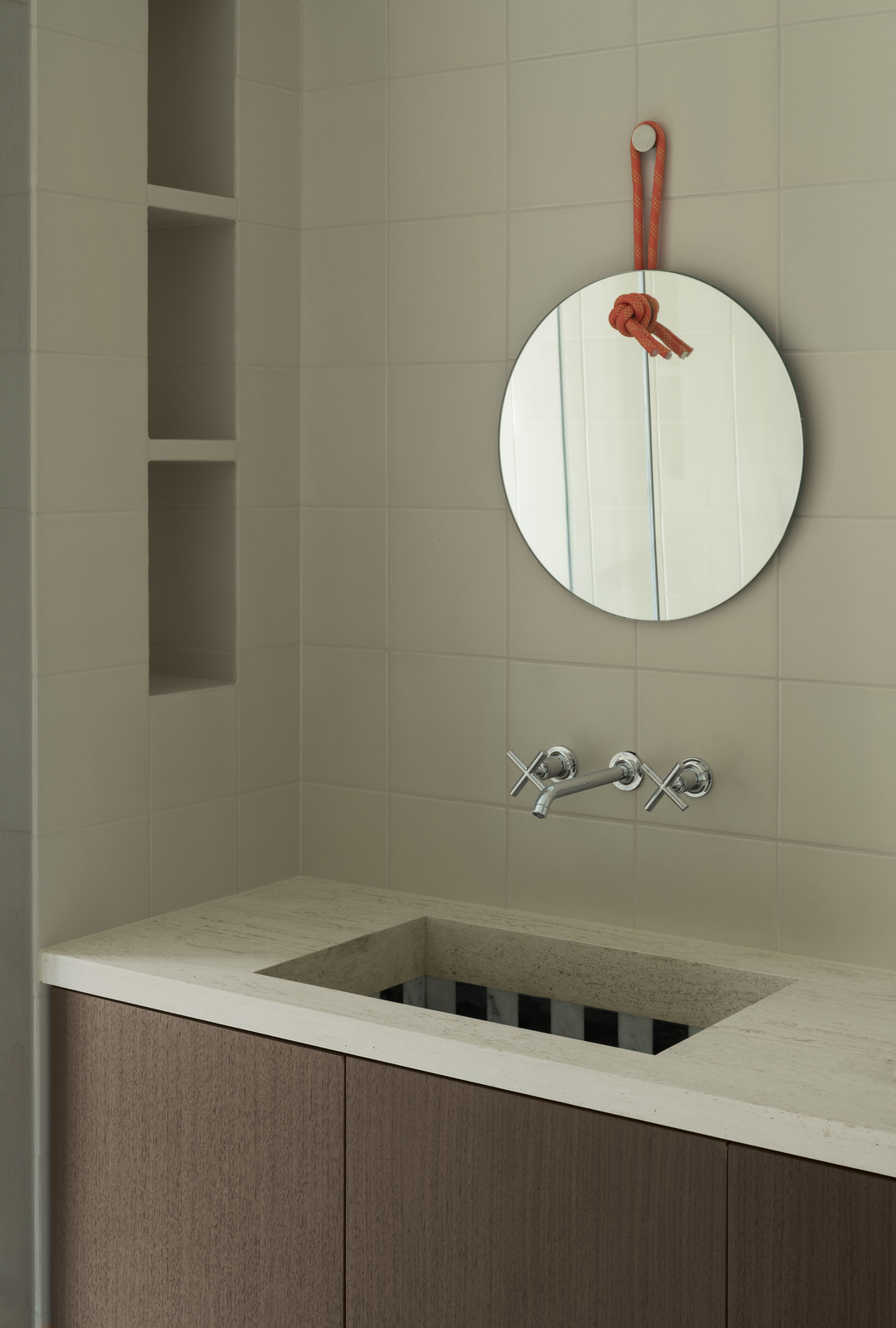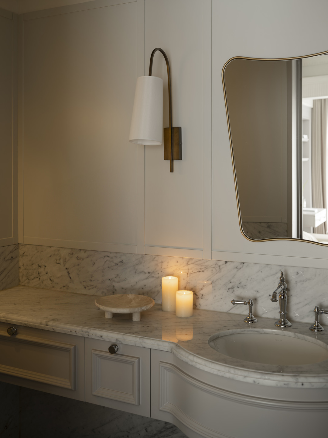 为了强调空间的整体性,进入卫生间需要穿过隐形门,让它像个隐藏彩蛋,创造出一种简洁、流畅的视觉效果。空间虽然面积不大,但非常精致,推门从镜子里看复古窗景也是一种享受。