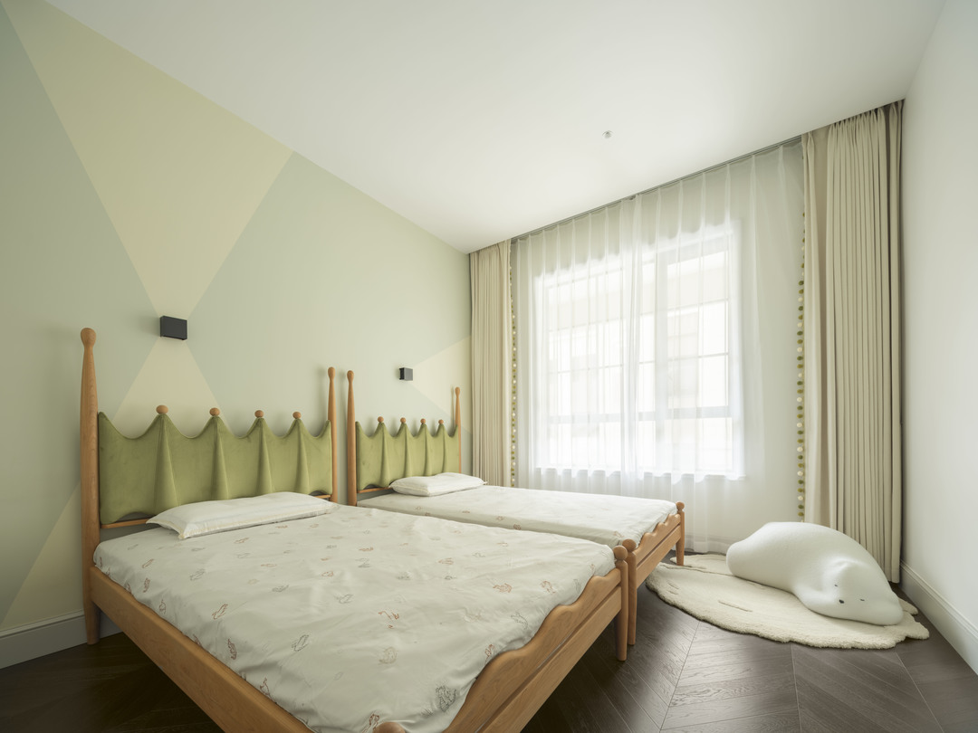 在二层为双胞胎打造了一个充满法式和童趣的卧室,而在另一间房暂时作为多功能房使用,为以后孩子打了后分房预留空间,现在则是他们的游戏房。
