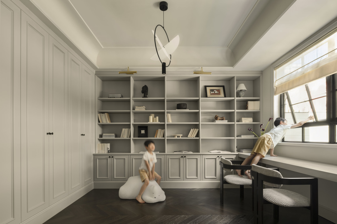 地上一层作为一个衔接地下空间和二楼私密空间的家庭共处区域,这里糅合了女主人国外生活的记忆,以及婚后育儿生活的新需求。古董柜里是女主人喜欢的复古餐具,拱形门洞+法式璧灯,除了好看,也是女主人很喜欢的好用空间,超大长桌可以让一家人一起看书做手工。