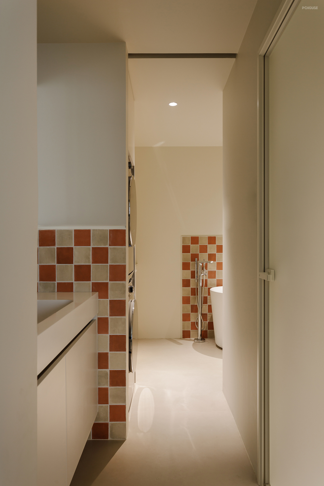 往里走,为家政区与淋浴、泡澡区。洗烘套装解放双手,脏衣物脱掉直接丢进洗衣机,动作流畅,节省时间。