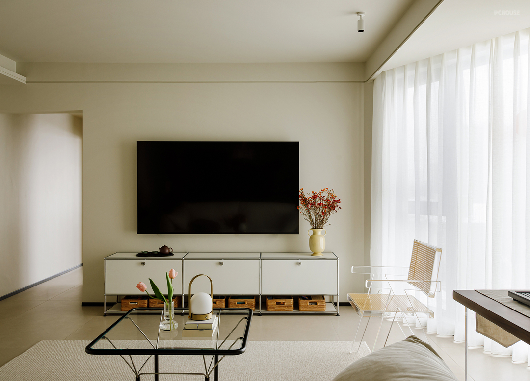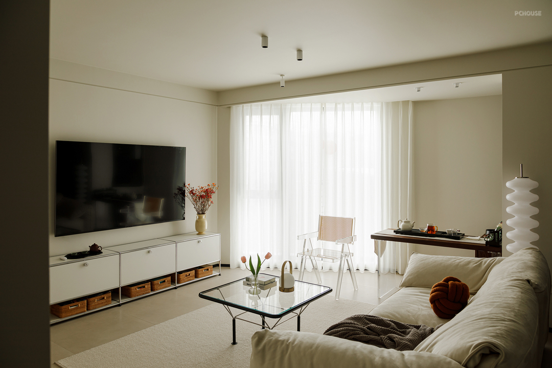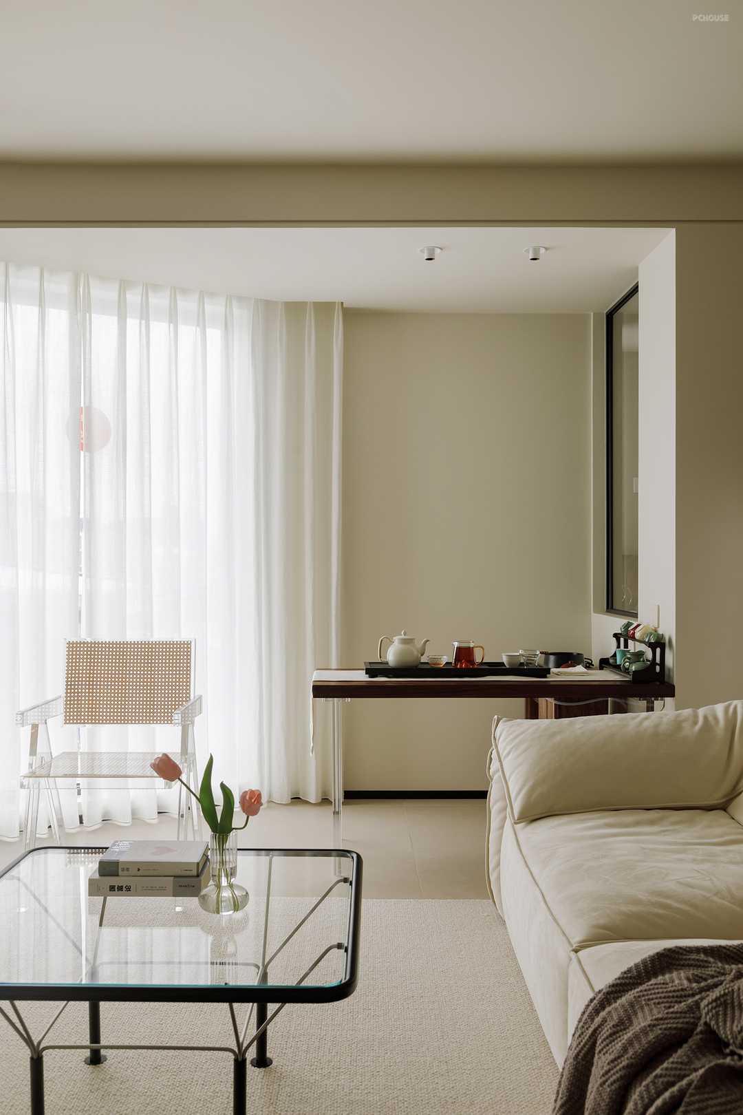 客厅无主灯设计,最大化保持空间的干净纯粹。窗帘透光不透人,过滤掉强光后,营造出柔和的空间氛围。