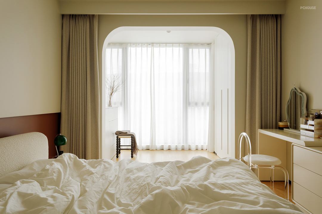 床尾增设精致的梳妆台,这里承载着女主人的梳妆日常,也容纳着无言的浪漫。将主卧阳台打造成休闲区,既可以享受开阔的视野和自然风光,还扩充收纳空间。