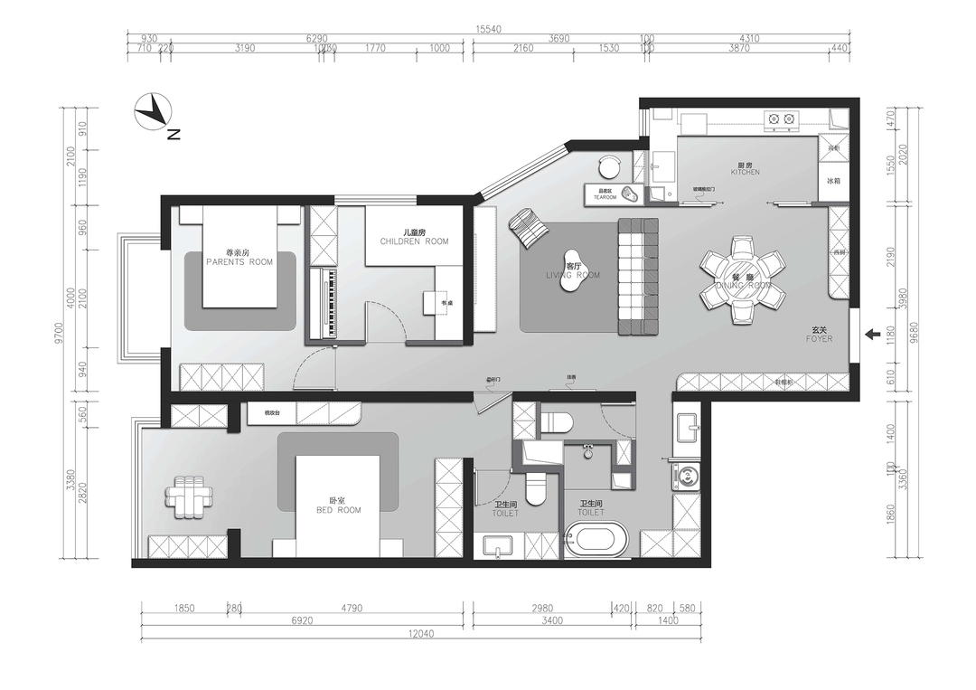 对两个卫生间进行重新规划布局,让公卫实现完全意义上的三分离,同时兼备舒适的浴缸区域,释放在外工作的疲惫感。同时改变老人房和儿童房之间的墙体,来满足这两个空间的功能需求。从而让居住者感受到别样的生活质量和幸福感。