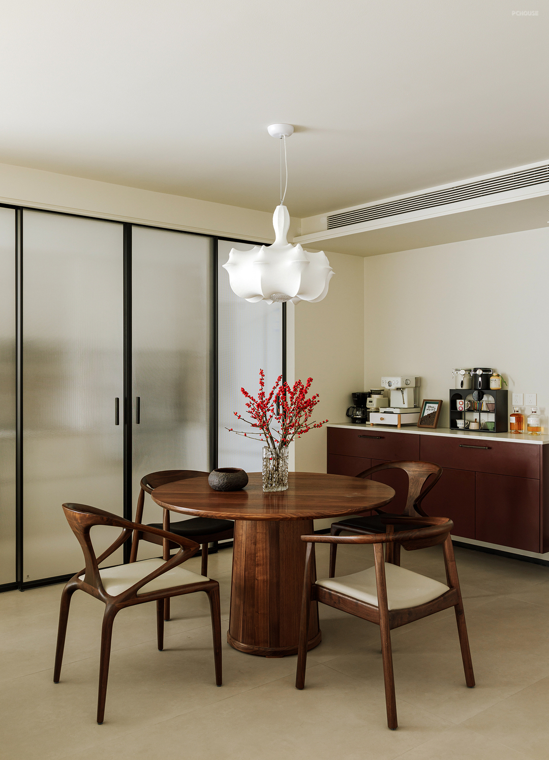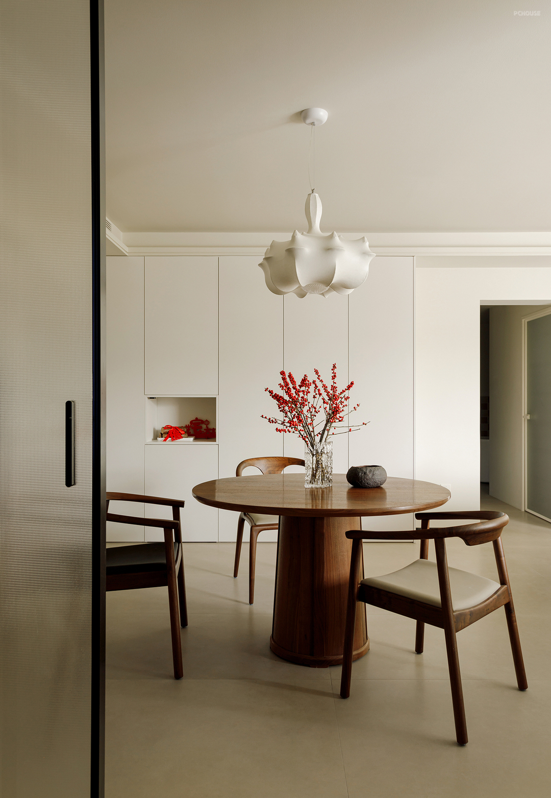 定制胡桃木餐桌椅流露出自然古朴气息,与餐边柜相得益彰,颜色的深浅层次以递进渲染情绪。蚕丝吊灯营造温馨用餐格调,也很契合柔美的空间质感。
