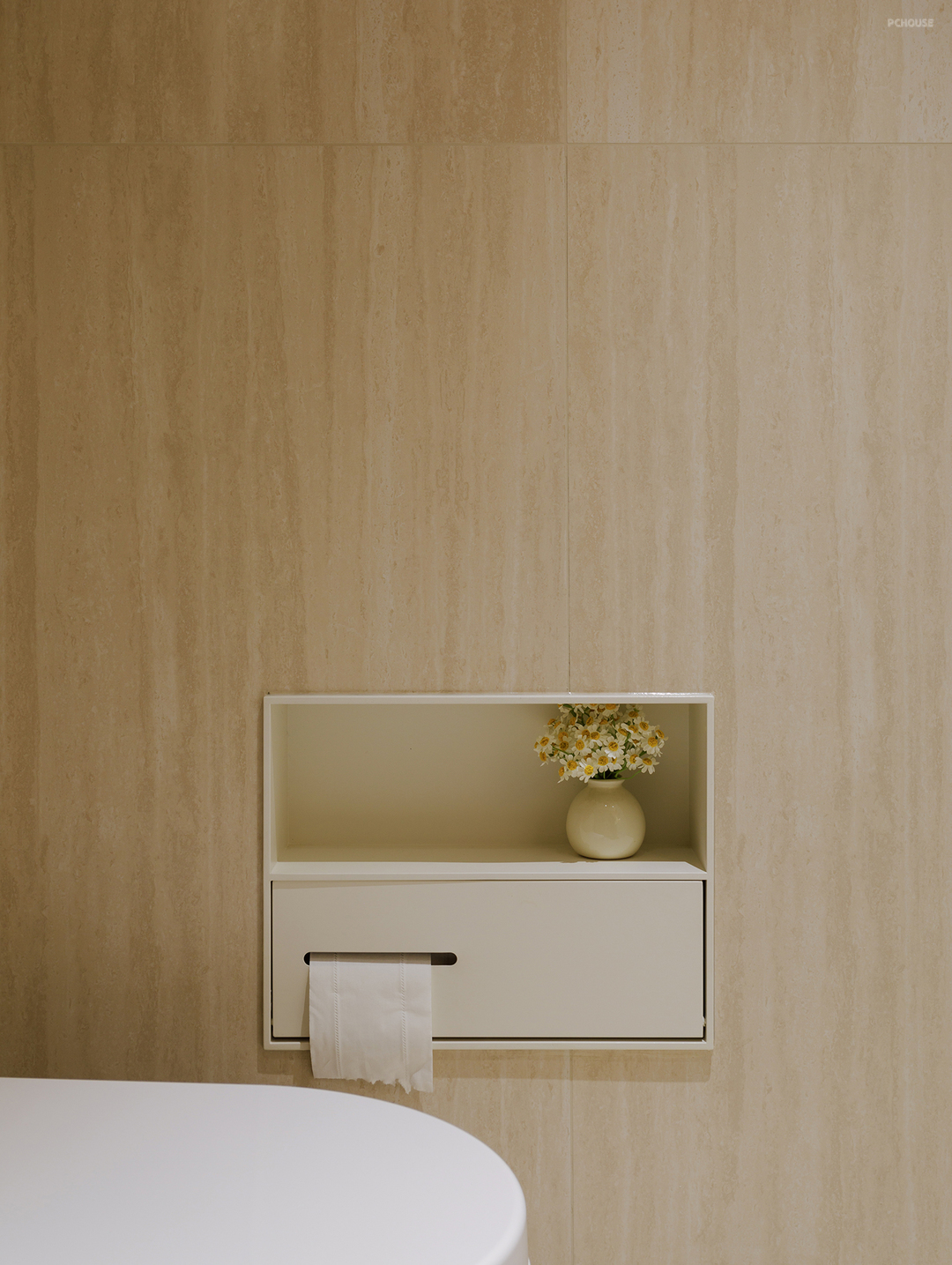另一侧壁龛设纸巾盒,拿取方便,上层置物区放小花瓶彰显居家精致感。
