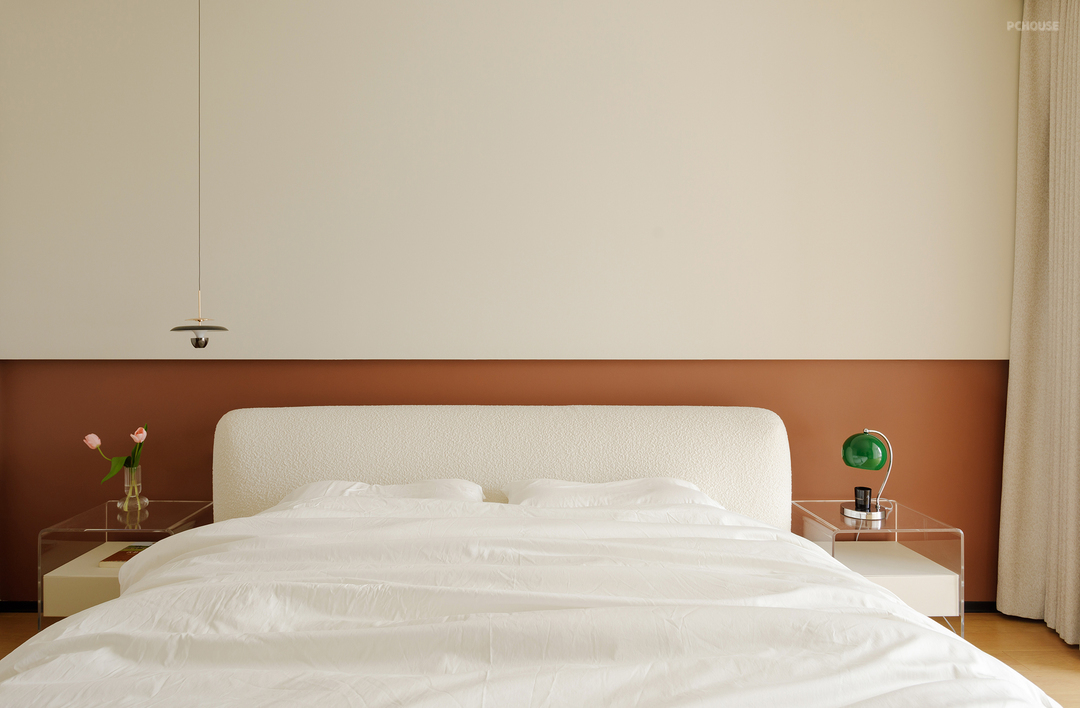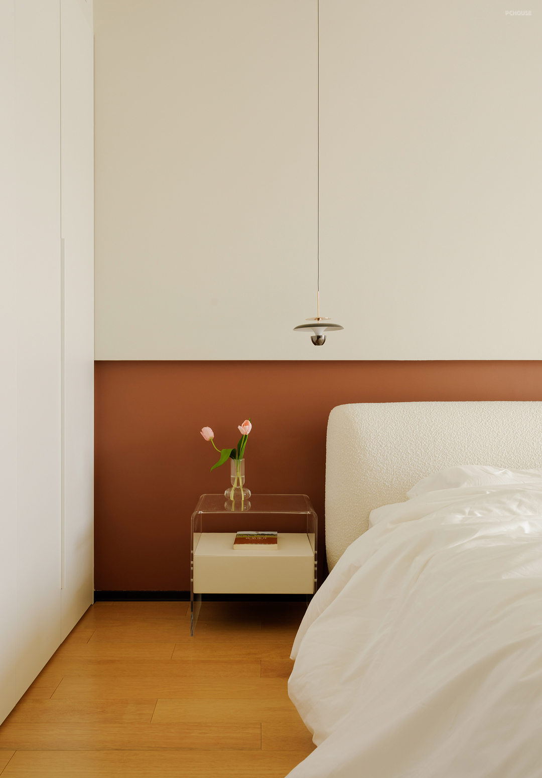 亚克力床头柜演绎悬浮视觉艺术,多层储物区置物面更大。飞碟吊灯上层泛光,下层聚光,营造氛围感,顶天立地衣柜提升储物能力。