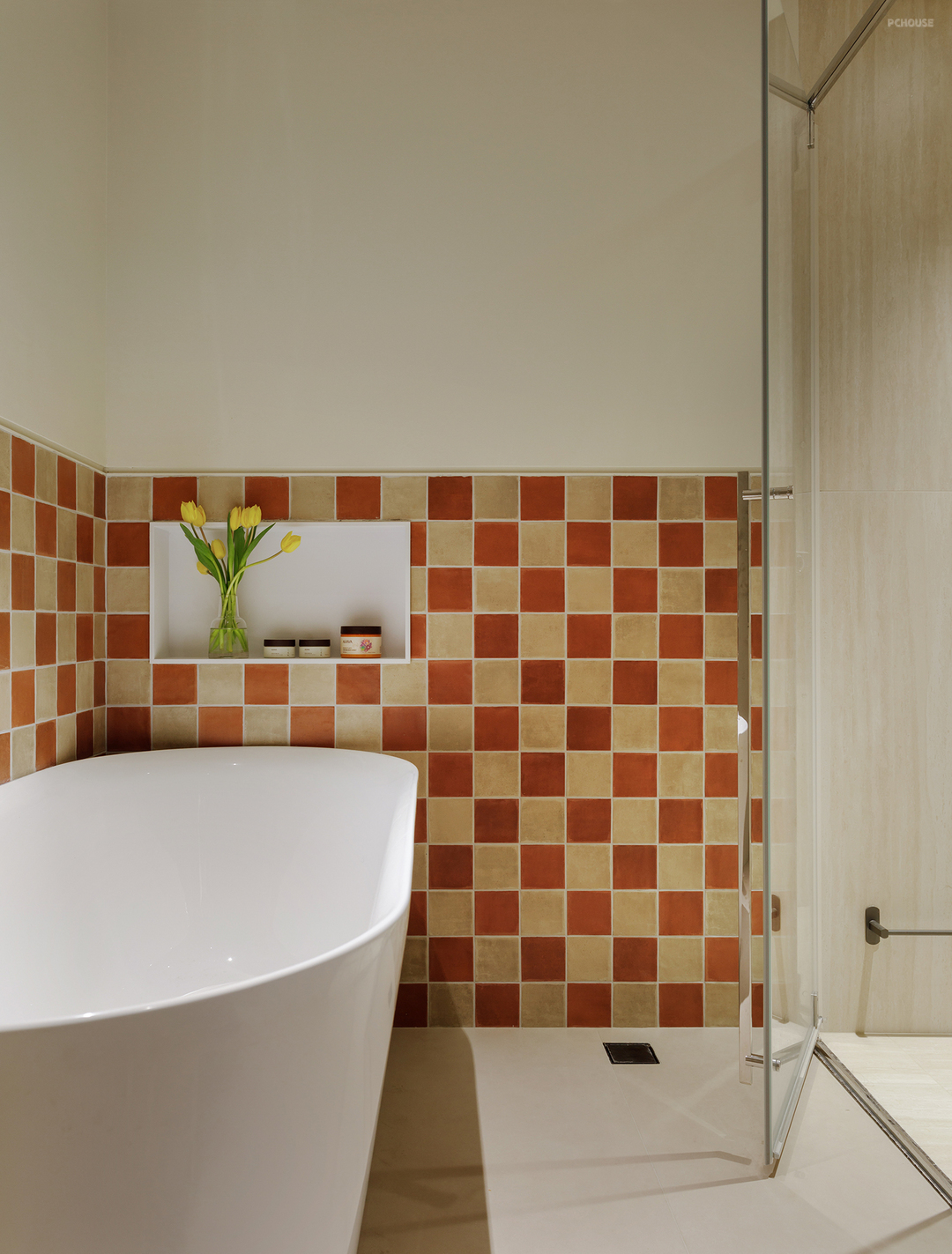 浴缸区同样设墙裙,保护墙体。将洗浴用品、花瓶放在壁龛处,使用方便。淋浴间采用玻璃隔断,不仅保证干湿分离,还增加空间的通透性。