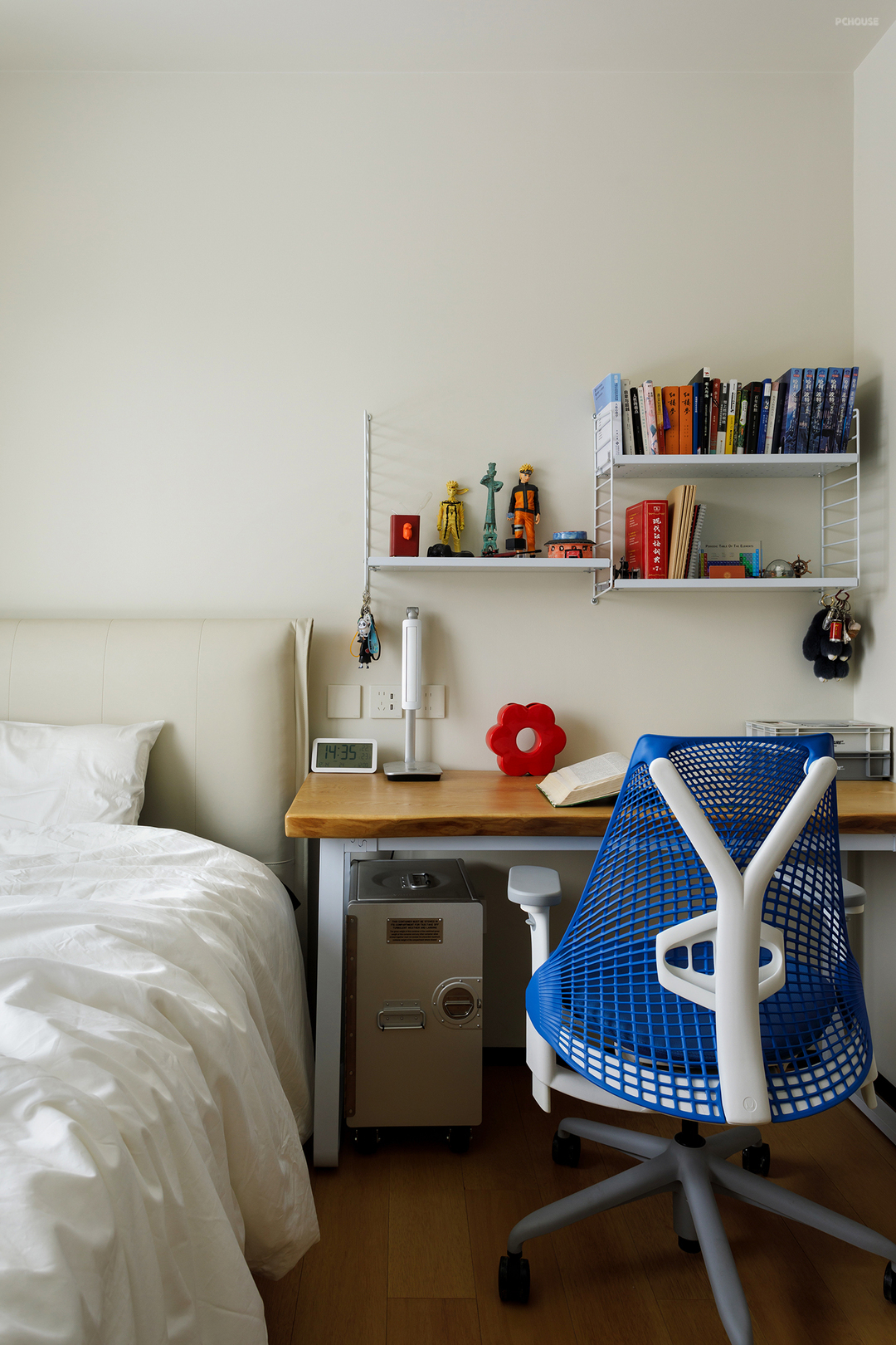 儿童房以简约实用为主,床侧设书桌,搭配人体工学椅,置物架上放手办、书籍,是孩子学习、阅读的地方。