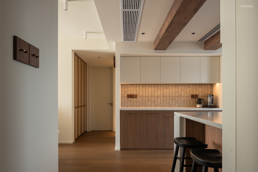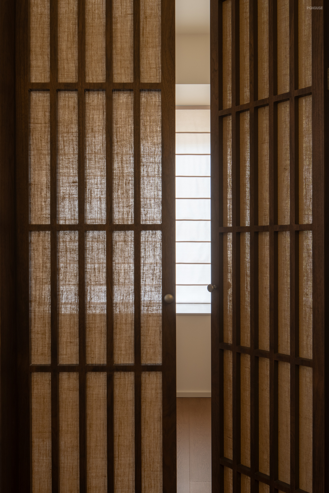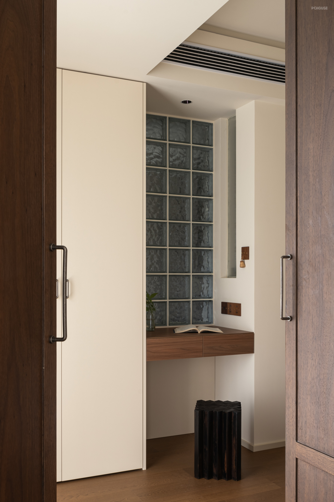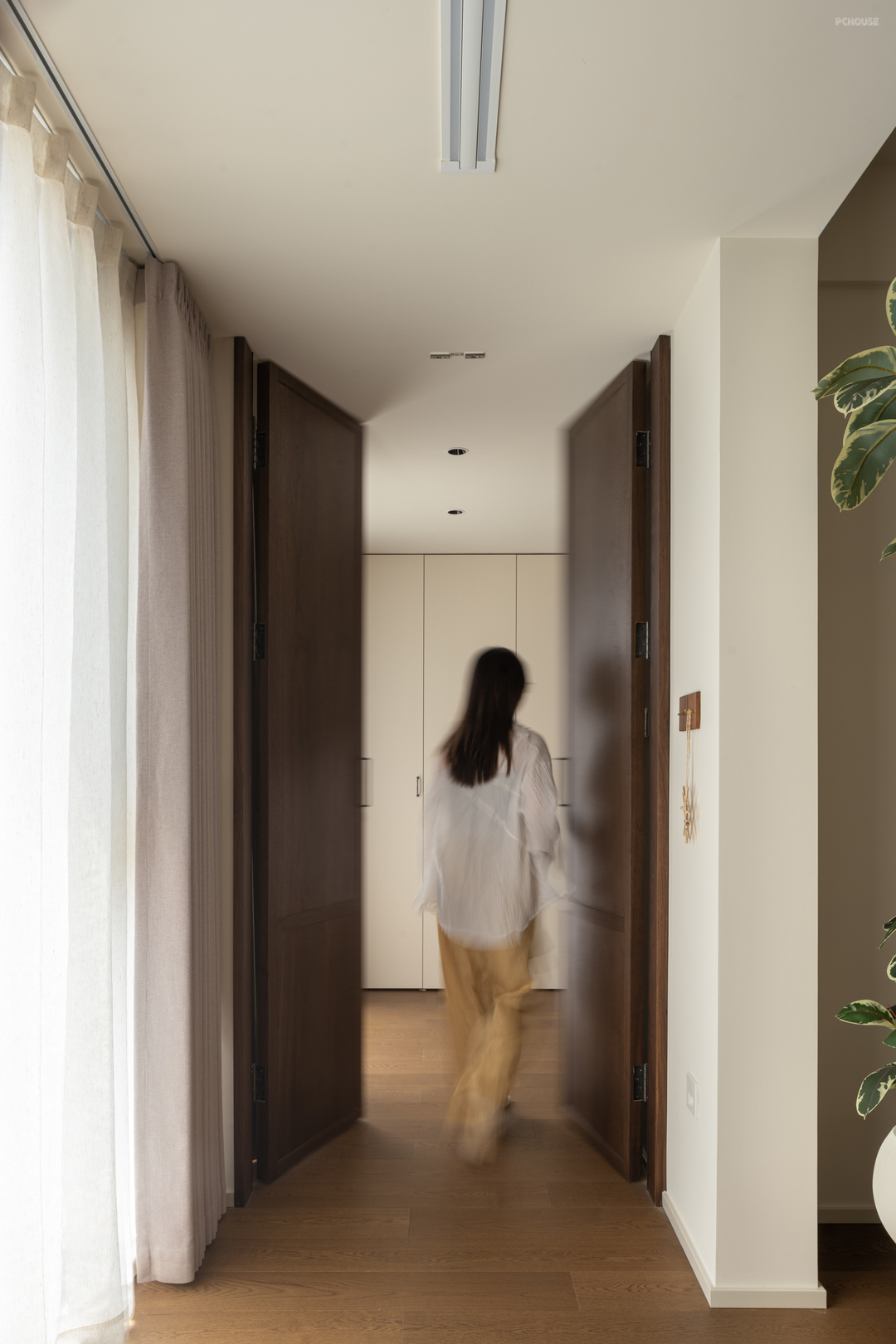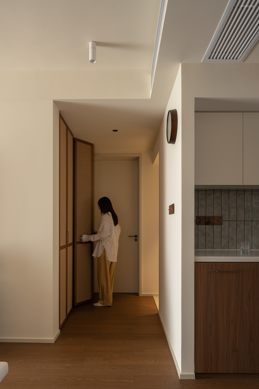 客卫对面是家里的杂物柜,存放家政物品的同时,也可以补充母亲房间的收纳。柜门采用了木色外框加棉麻材质饰面,延伸了公区的度假风格。