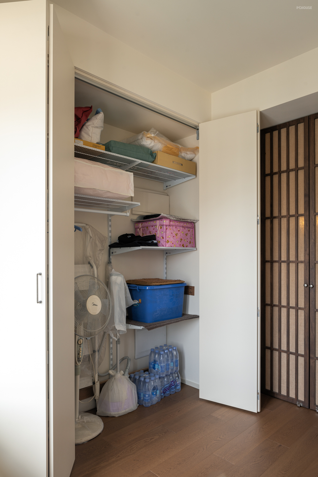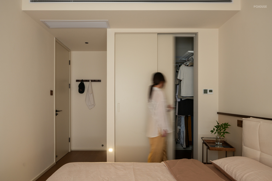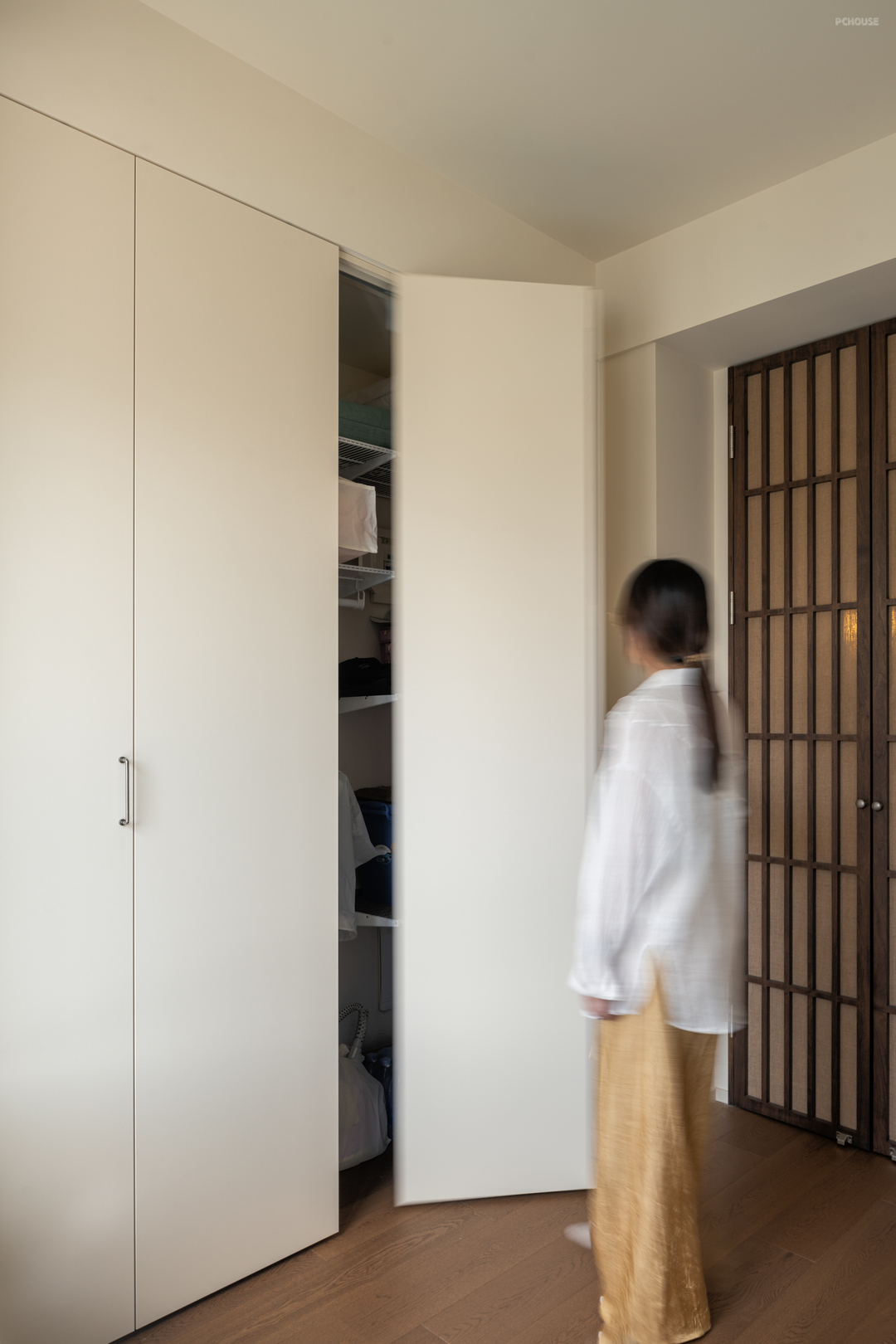 回到一开始的玄关位置。我们保留了一个客卧,亲友拜访的时候方便留宿。当然,它还有另一个重要功能——承担全屋的换季收纳。
