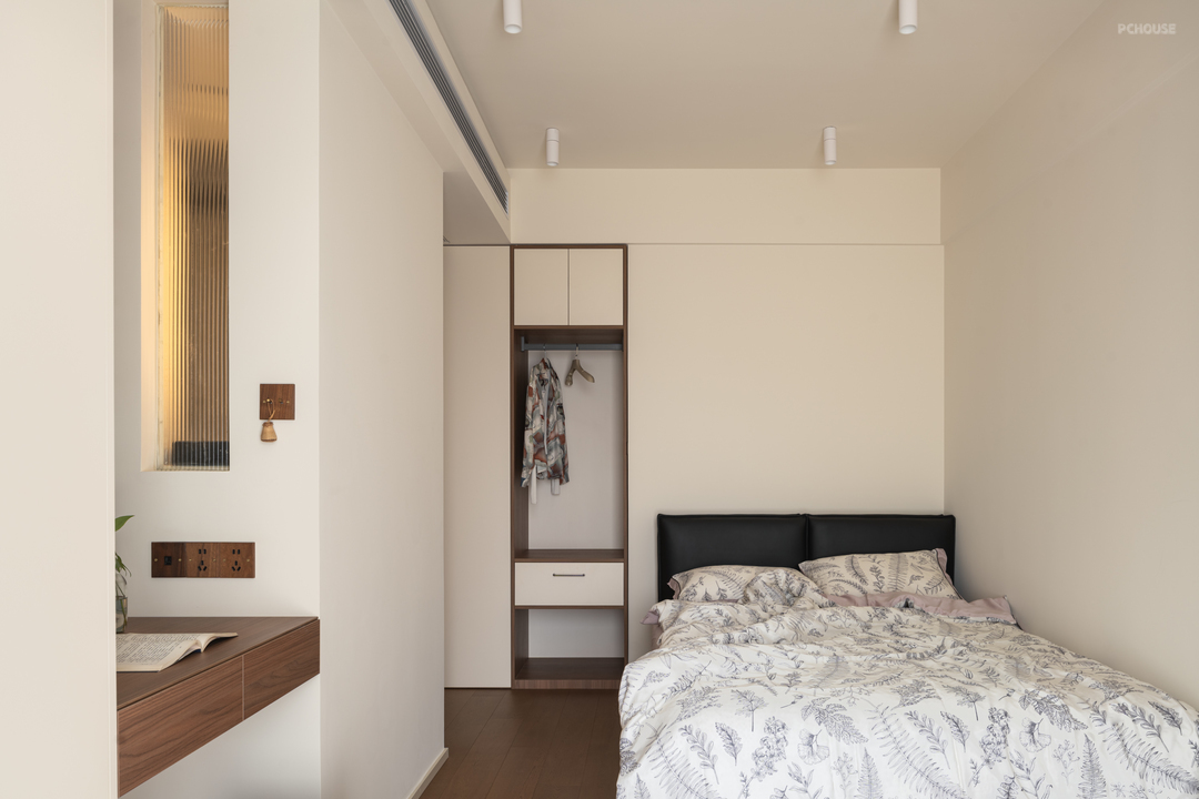 1.5米的单人床安排在角落。业主在海外留学时,一直习惯床两面靠墙,异国生活留下了烙印,如今在新家里也做了相似的布置。