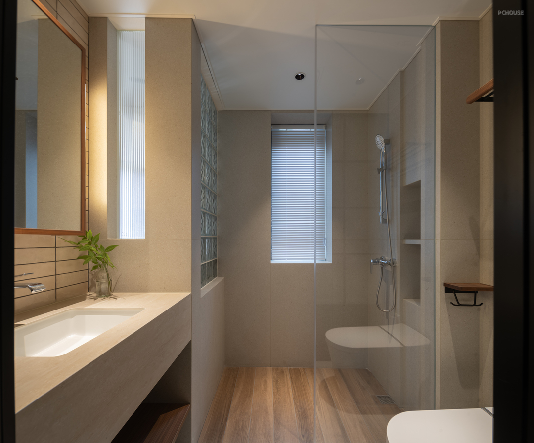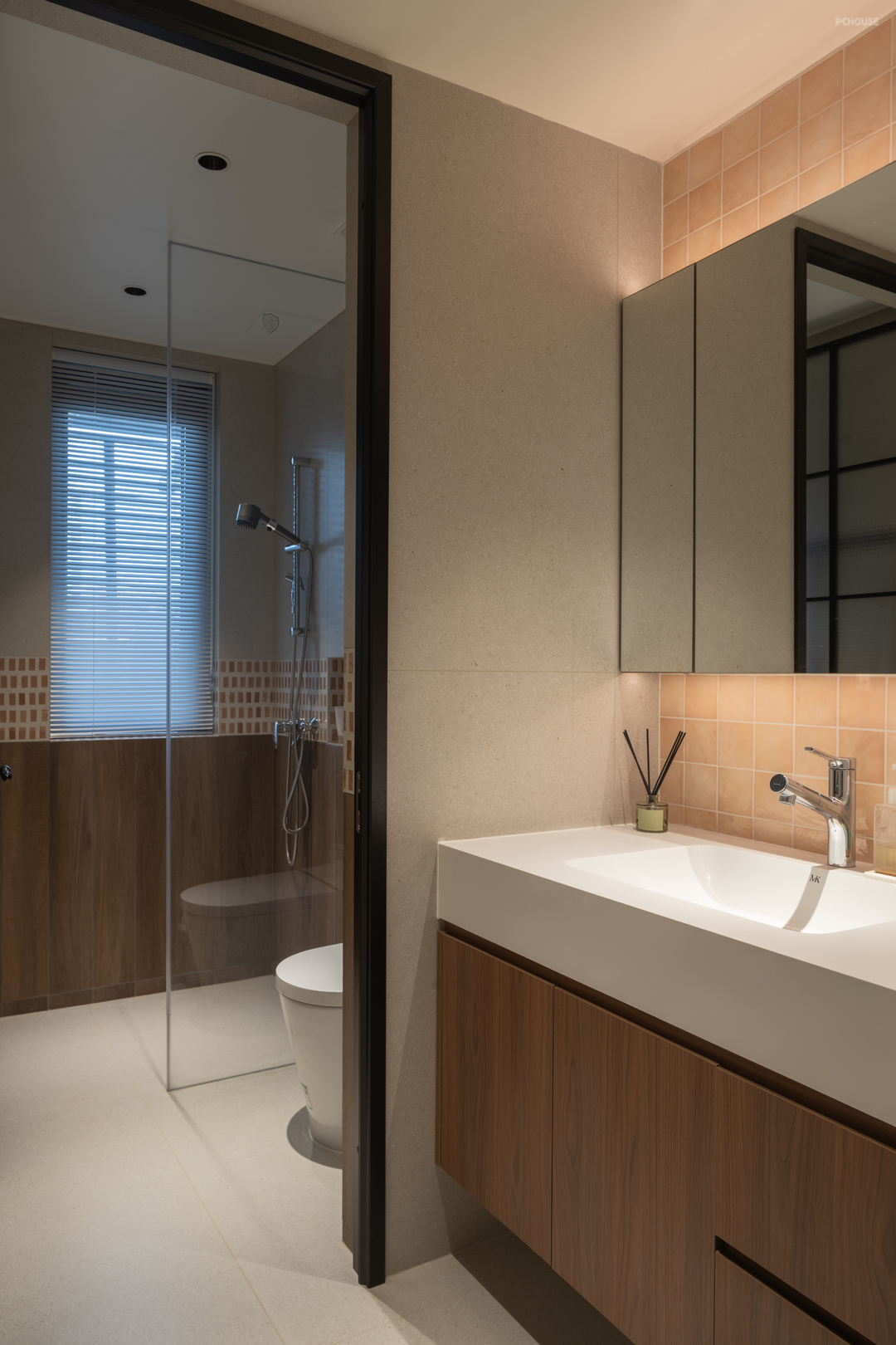 瓷砖的搭配上,与主卫相反——地面铺奶油纯色瓷砖,墙面铺木纹砖。一点点巧思,给房屋增添乐趣。