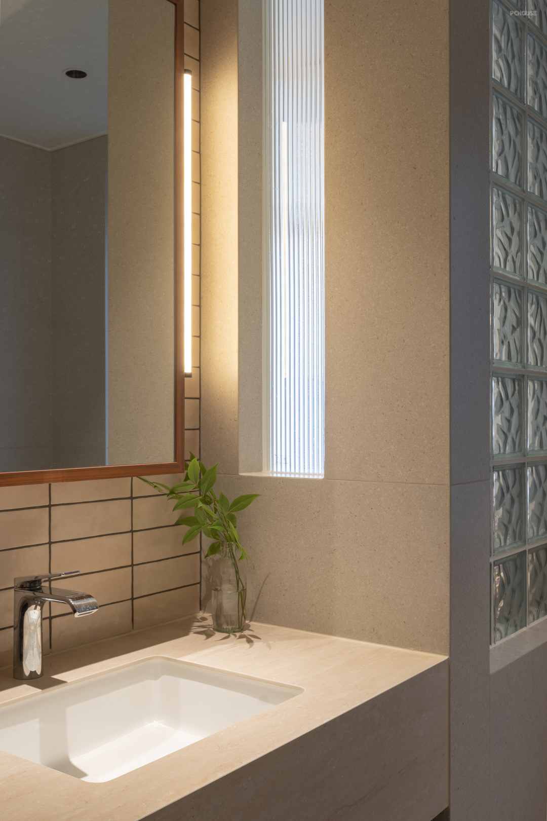 与业主商量过后,我们在局部采用了软膜天花,另外在镜柜边缘形成环绕照明,绝对的化妆人士友好。墙面砌出壁龛,用来放需要通风透气的电动牙刷和洗手液,又可以保持台面干净。