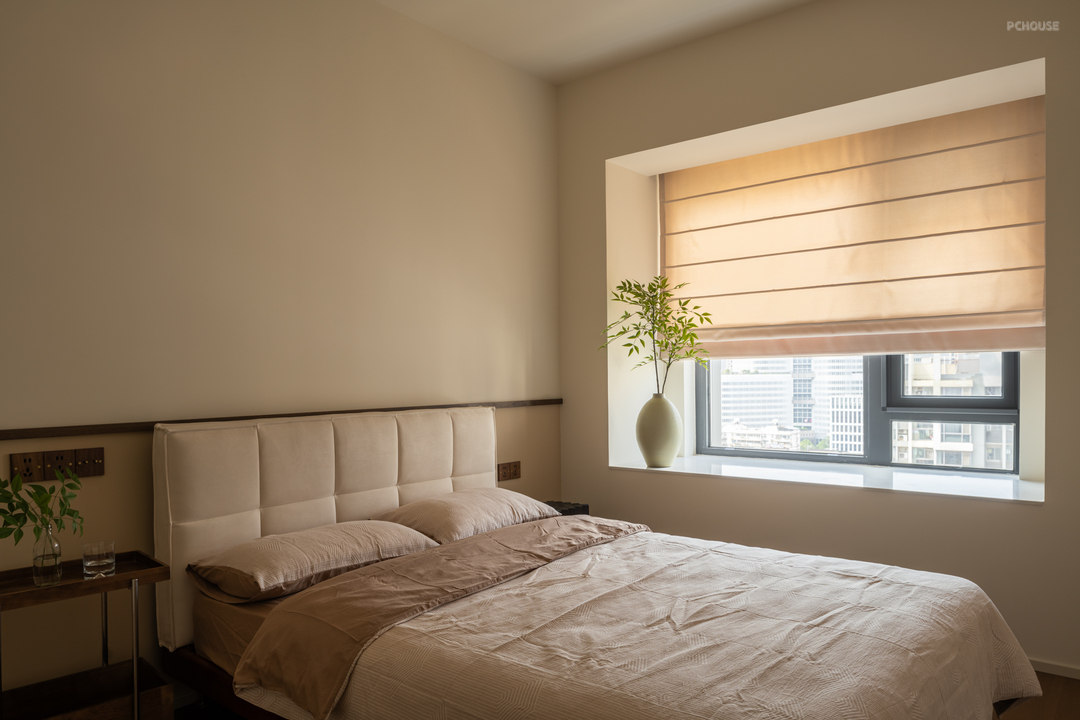 母亲房配色淡雅。最早的方案中,我们在主卧加入了一些装饰,都被业主妈妈一一否决:“简单耐看就好。”方案改动后,卧室以最自然、舒适的形态呈现。