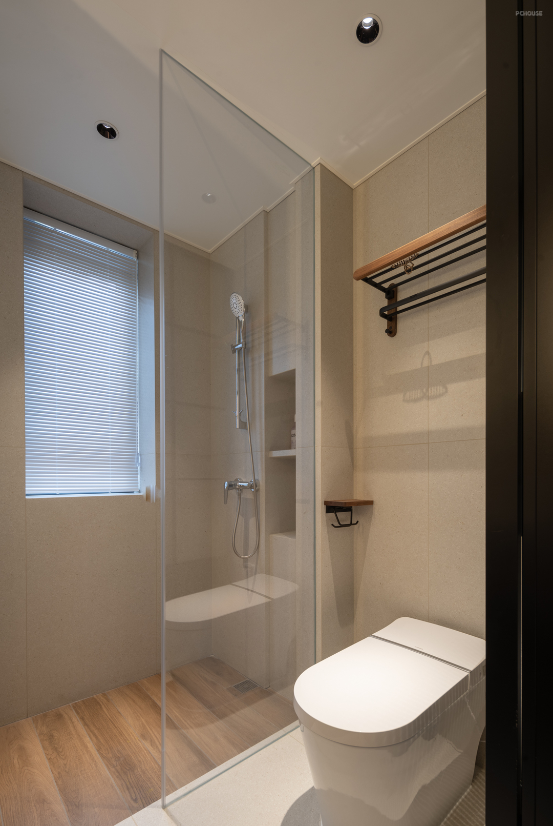 淋浴区铺颜色更深的木纹砖。淋浴区做了下沉设计,以防溅水。
