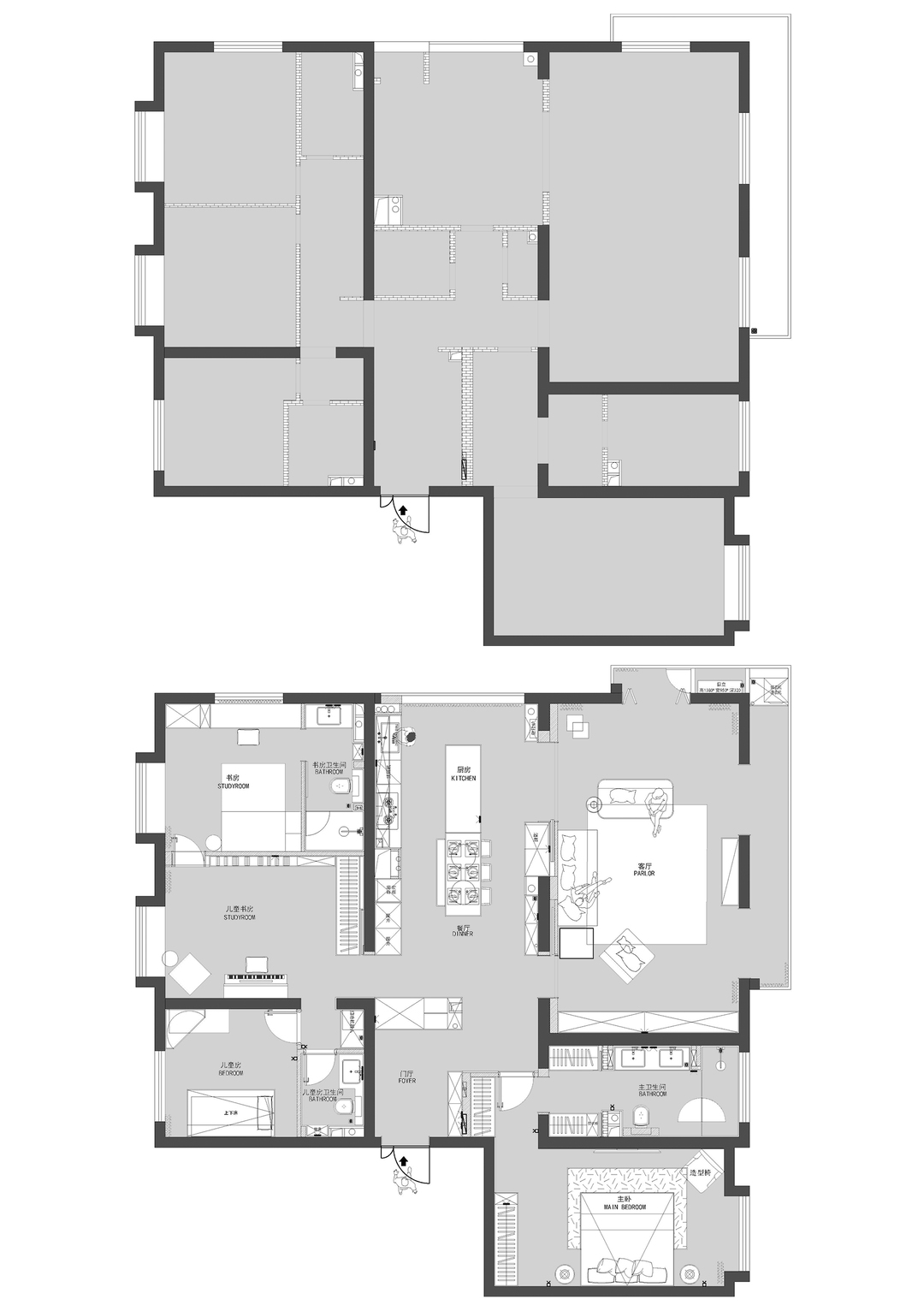儿童书房拆除多余的轻体墙引光入室,将空间拓展至最大尺度。书籍的色彩自然融入背景,既满足作业、练琴、手工等学习需求,又为孩子营造出自由舒展的成长氛围。