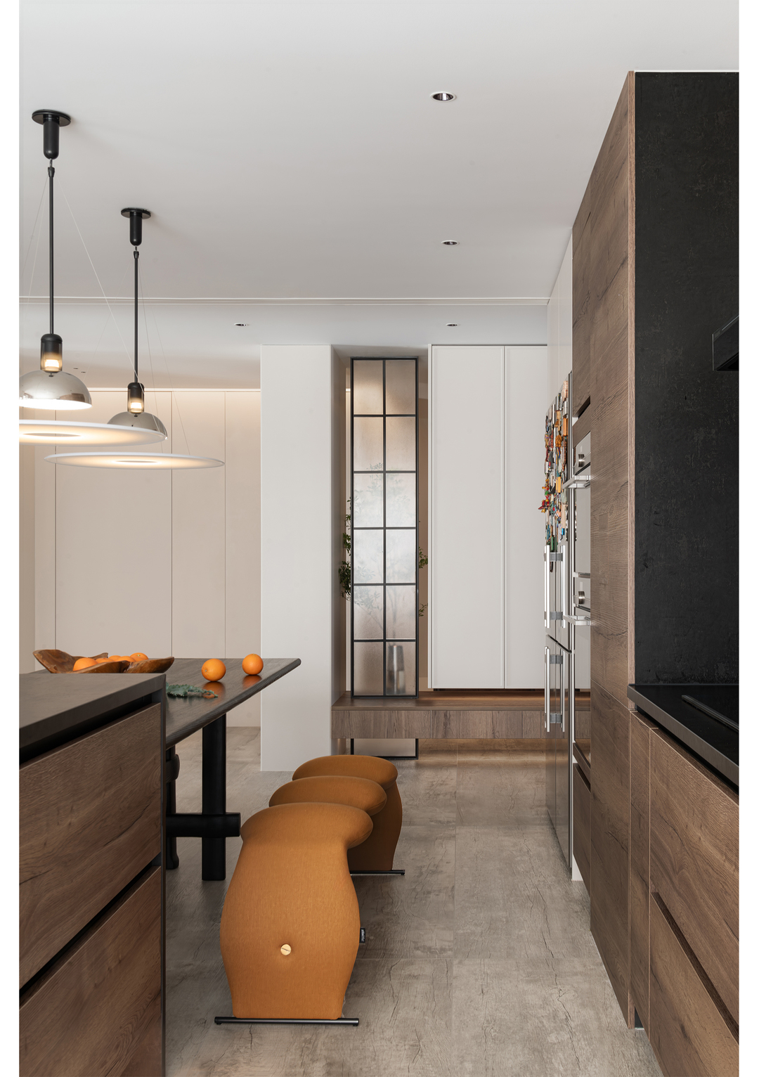 餐厨区拆除轻质墙体引光入室,36 平米空间居于中轴,既是高频使用的生活锚点,更是家庭情感的经纬:向北串联儿童房、儿童书房与主书房,承载孩子的成长思辨与长辈的静谧沉思;向南呼应开阔客厅,让烟火日常与起居欢娱自然衔接,编织起多元场景的交互网络。木纹与金属碰撞出细腻质感,吊灯借光影书写温柔让餐厨成为生活的质感剧场。