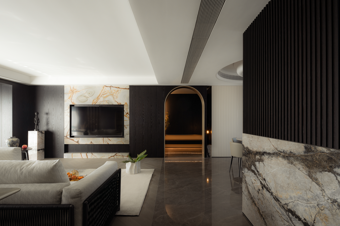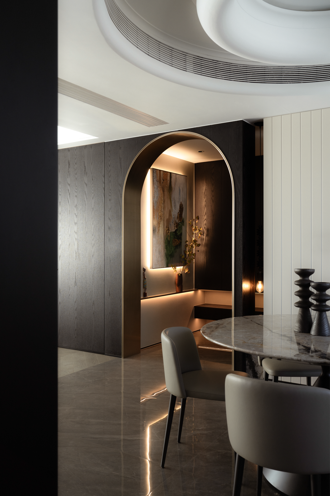 人向往的家宅归属感,除了具备向外的包容性,同时也拥有向内的松弛感。入户门采用圆弧造型衔接内与外的联系,打破平淡界限,归家的仪式感从入门开始便缓缓展开。