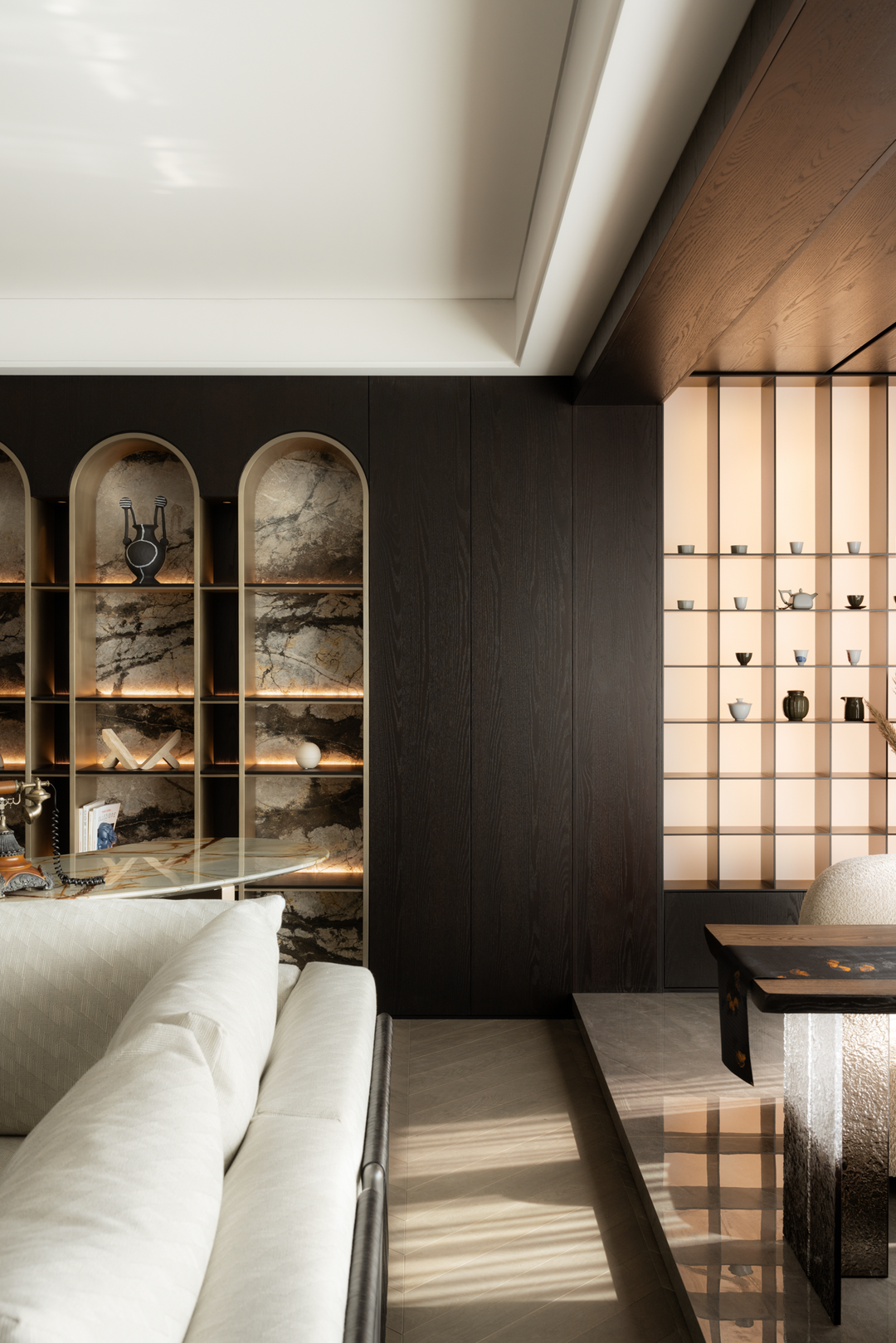 品茶区的抬高设计是对动到静的过渡处理,阳光渗入,日出而作,日落而息,透过窗格,透过墙面,随着时间变化,慢慢在空间里晕染开来。