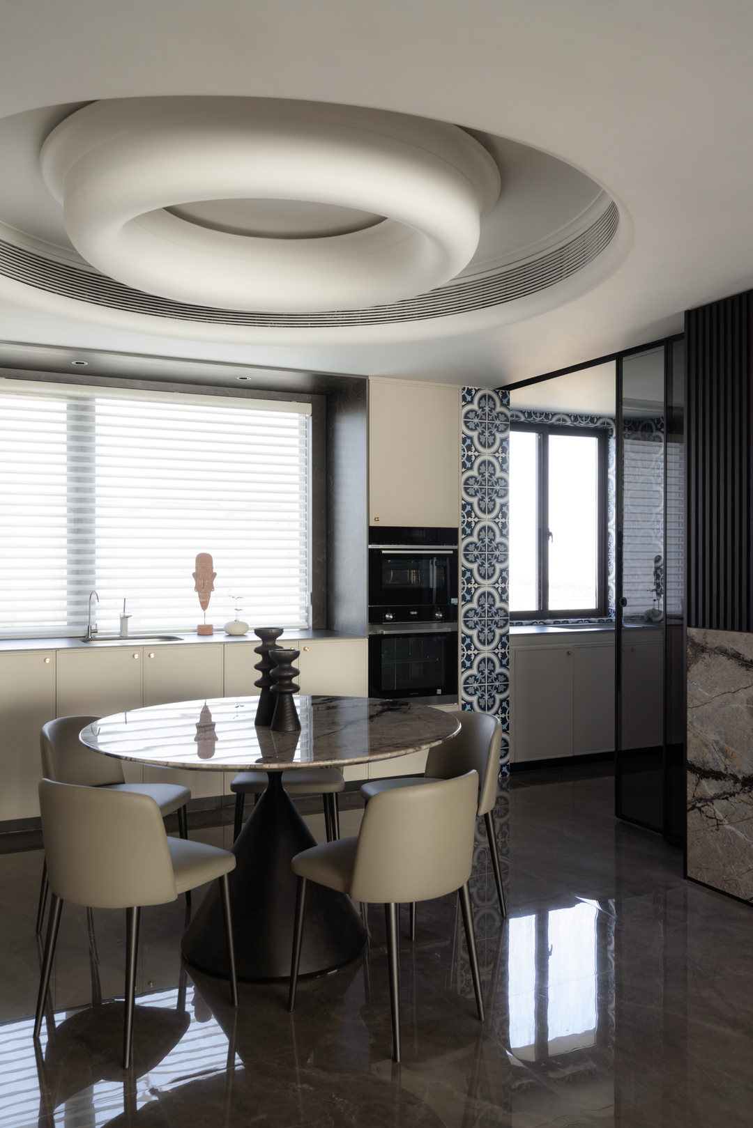 厨房墙面以复古花砖拼贴,强烈的色彩和精细的花纹渗透到每个细致末微的感悟,为空间增添了别样的风情,投射出家人共享的无数美好瞬间。在餐厅一侧增加了西厨区,最大化利用空间,根据生活场景的需求调整其功能。
