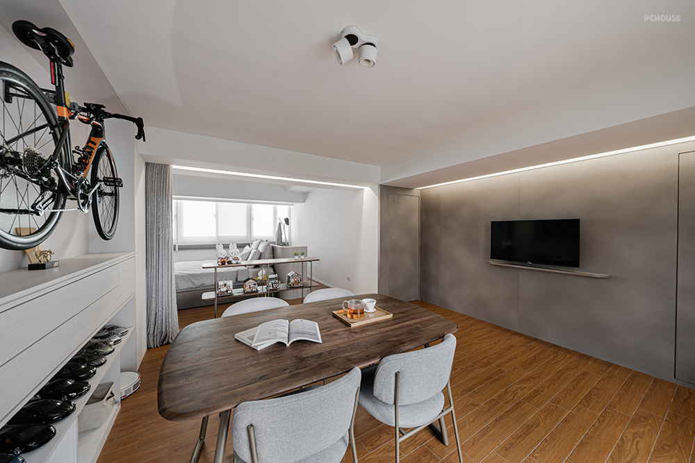 设计舍弃传统的隔墙隔间,将客厅和卧室的空间打开,用软装门帘的方式区分开来,视觉感延伸的同时仍可保有私密性。