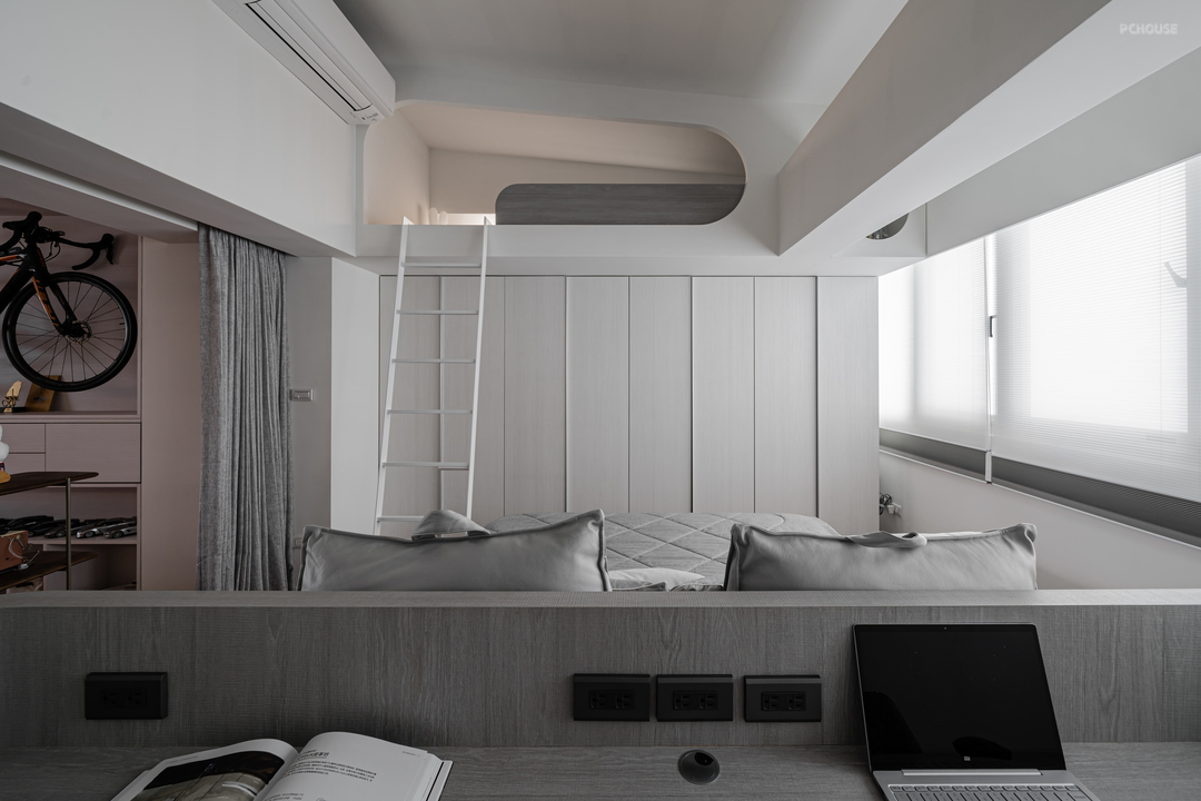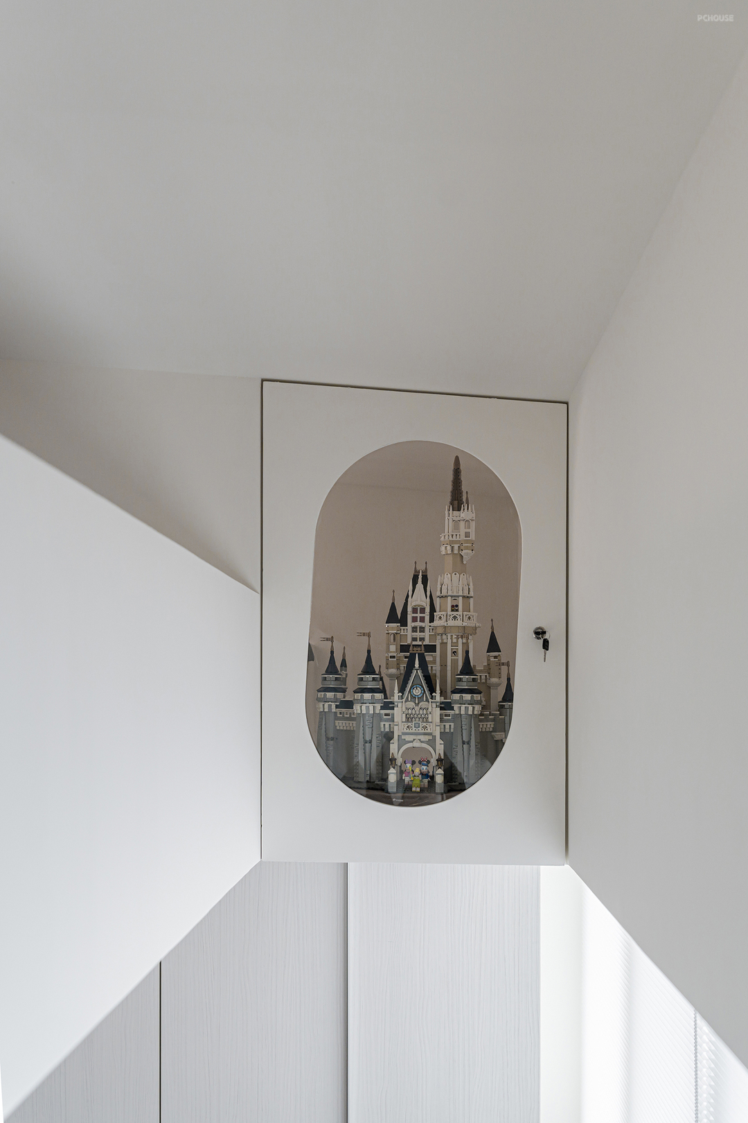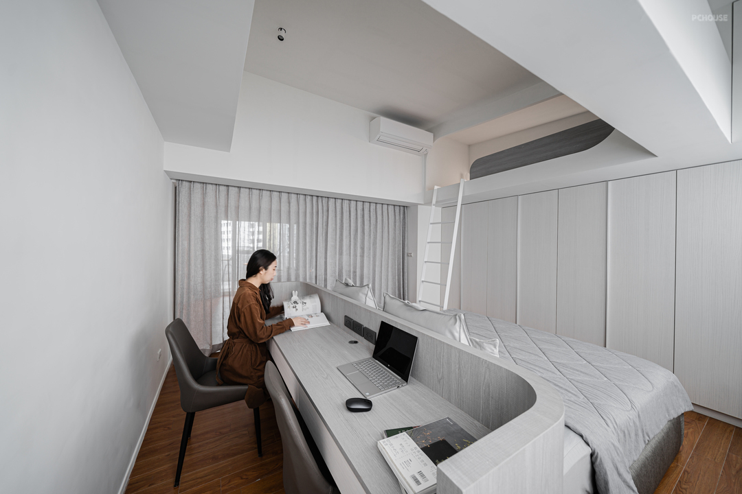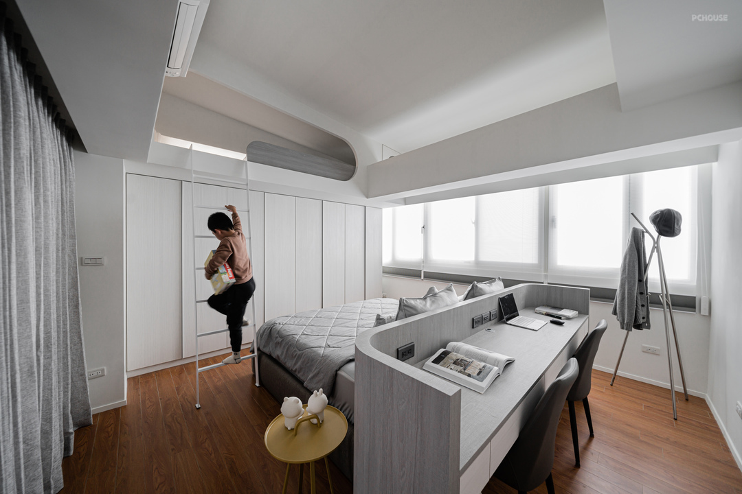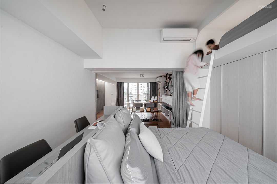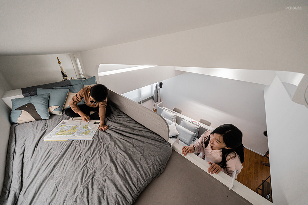最具有特色的就是在层高3.8m的卧室空间,在衣柜上方创造出的小阁楼,提供孩童一个属于自己的小空间,可以睡觉也可以阅读、游玩,完美的避免了使用夹层所造成的压迫感。
