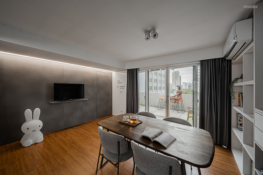 保留了1/3的空间给户外作为露台花园以及工作阳台,户外桌椅搭配绿色植物,提供放松身心的场所。