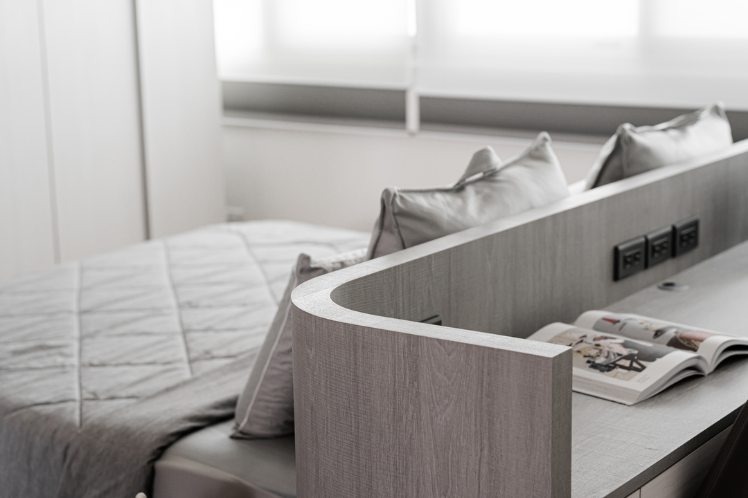将卧室的床头板和书桌做结合,长书桌提供全家人同时使用,陪伴工作两不误。