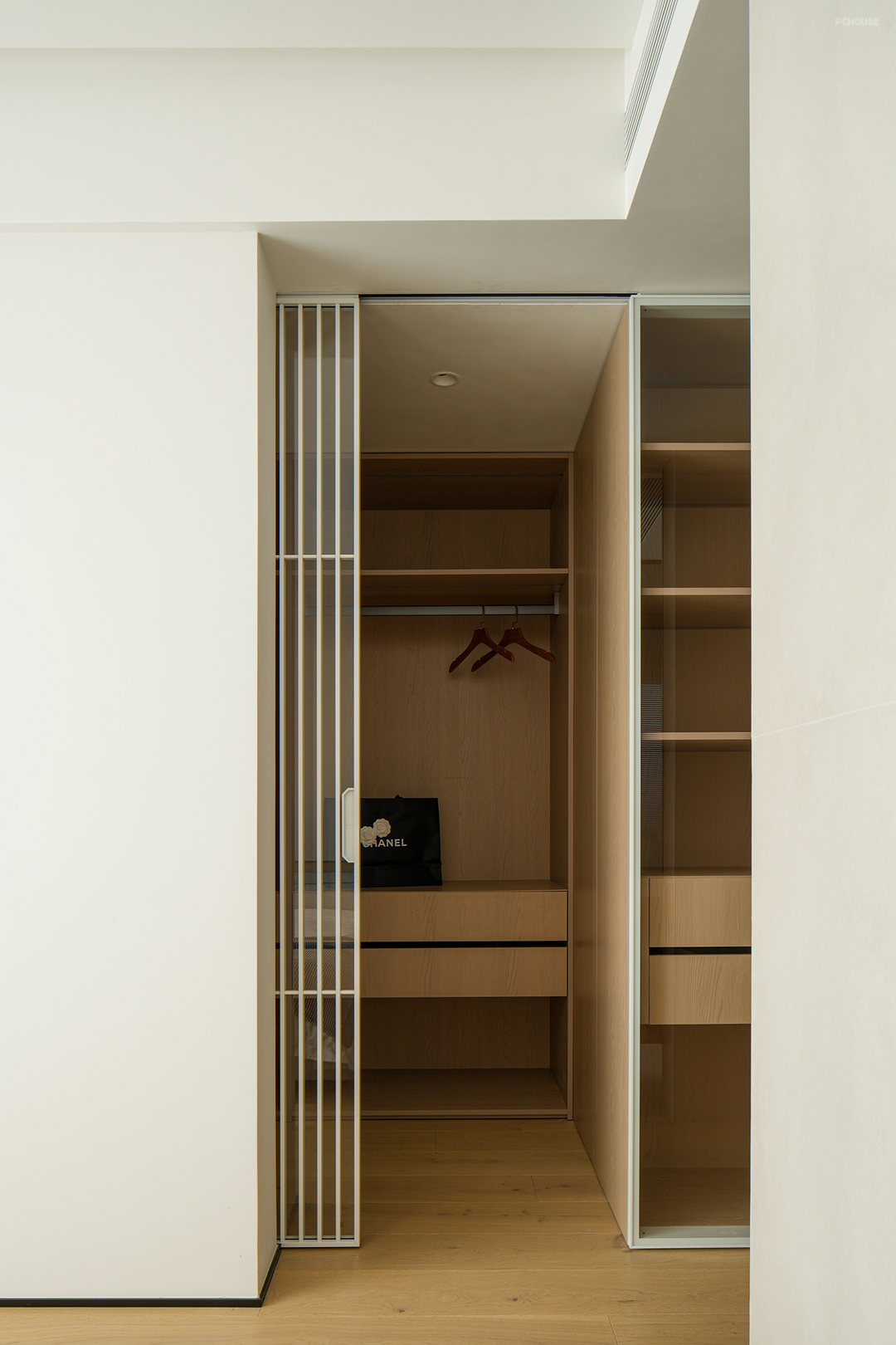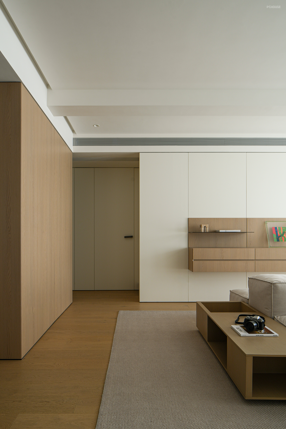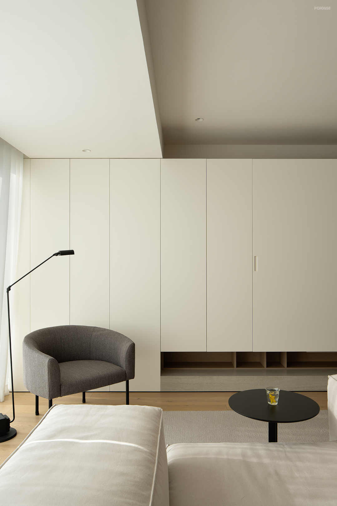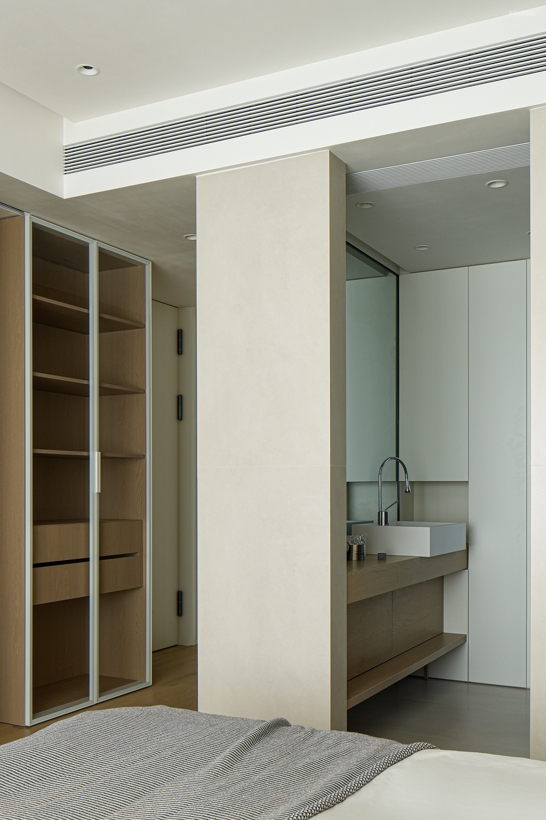 继续在生活中保持着一份理性的秩序,以生活动线和收纳为主线规划寝居空间。卧房入口、卫浴、衣帽间入口并列于一条轴线,以此连贯铺展。
