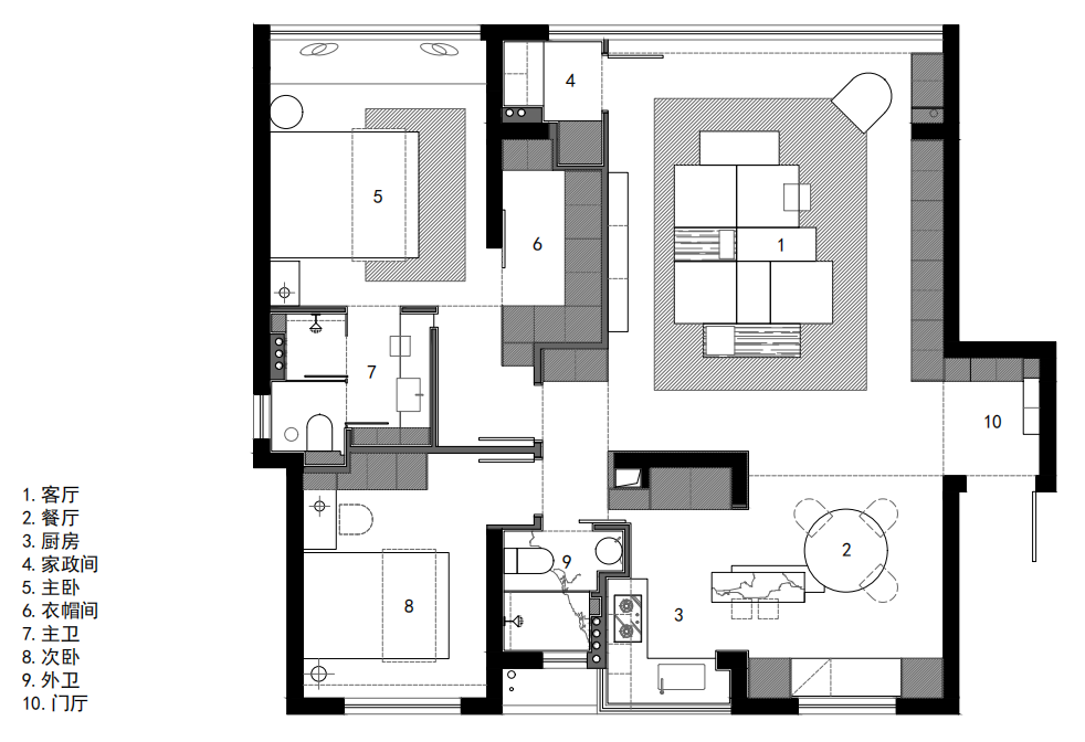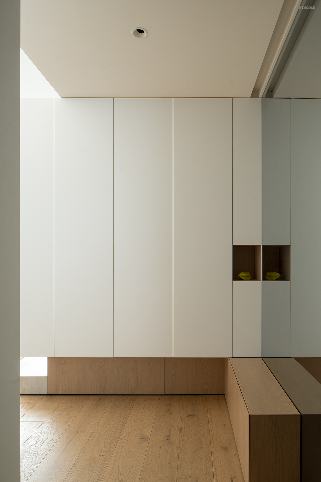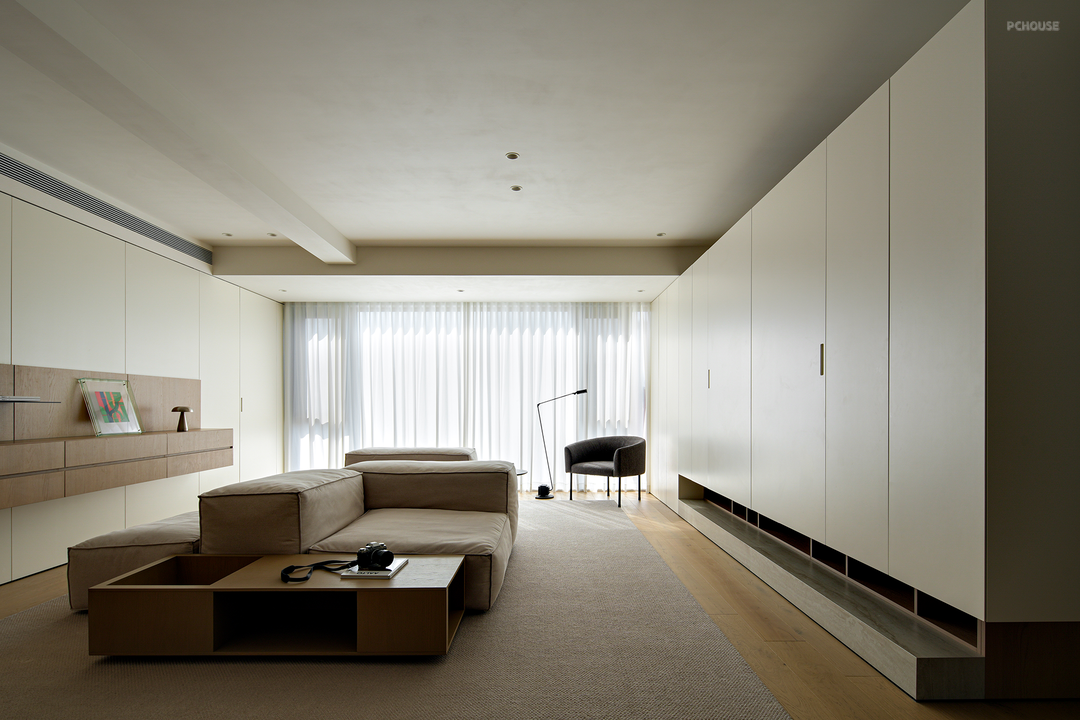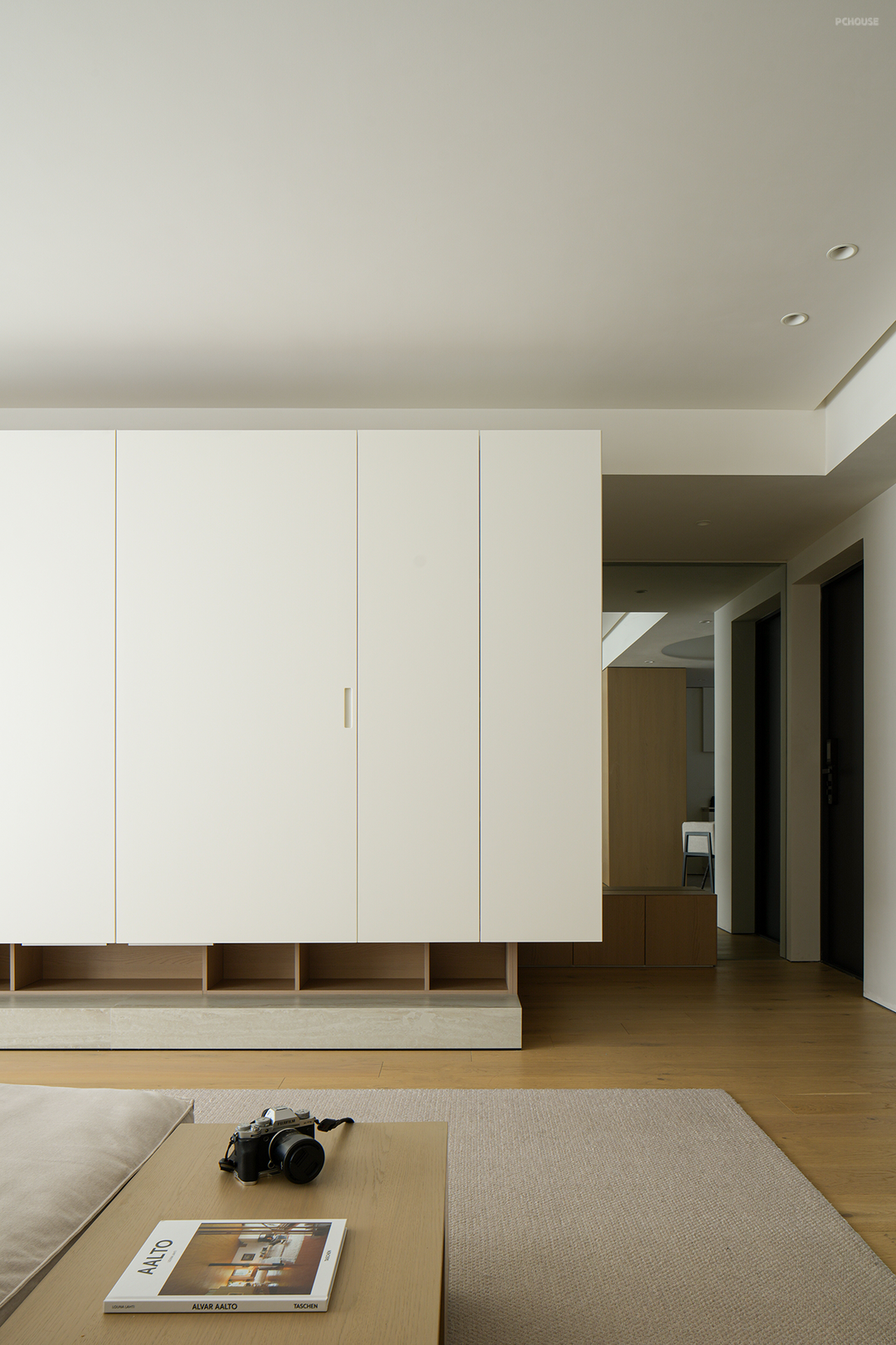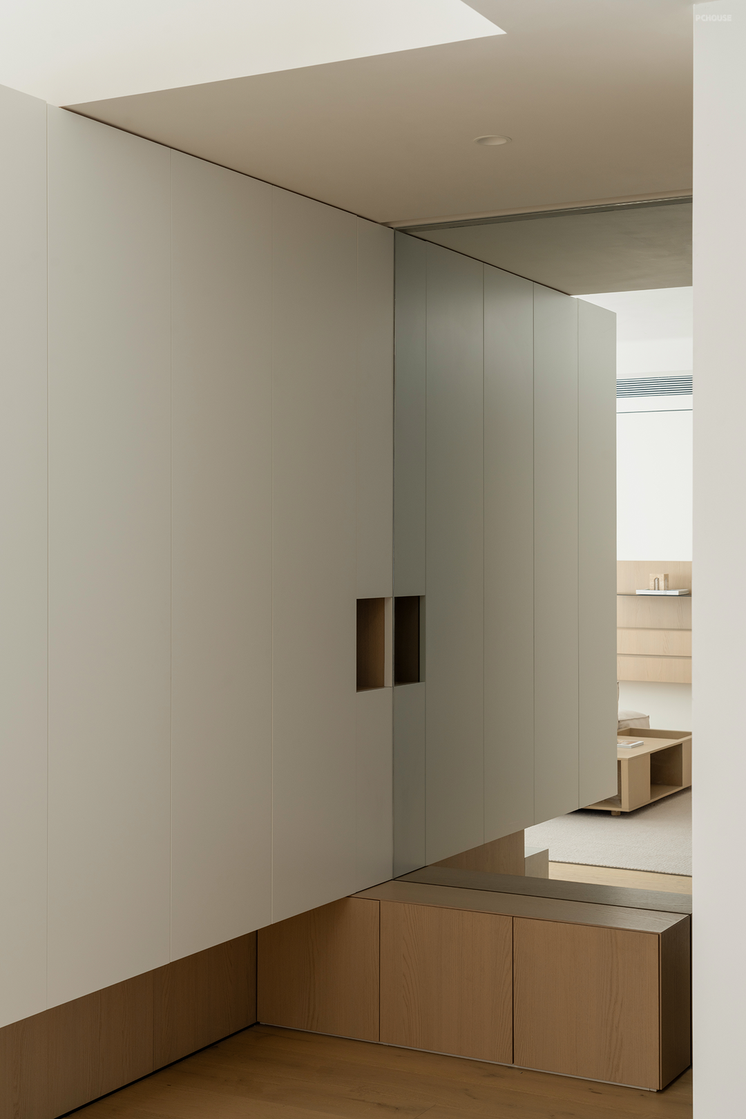 继续在生活中保持着一份理性的秩序,以生活动线和收纳为主线规划寝居空间。卧房入口、卫浴、衣帽间入口并列于一条轴线,以此连贯铺展。