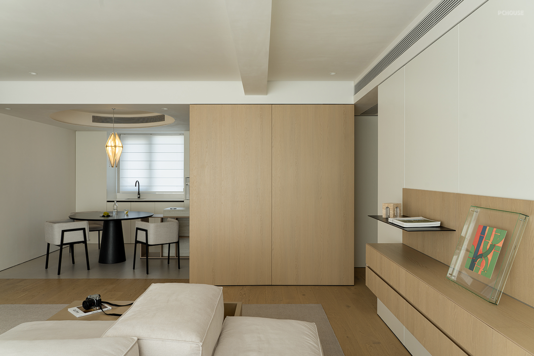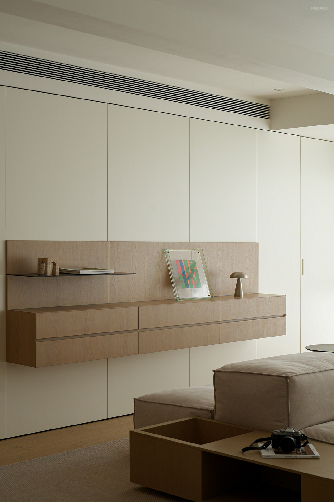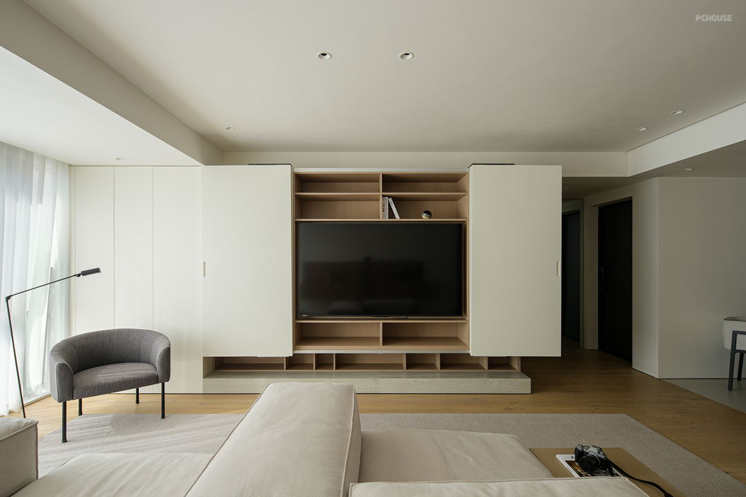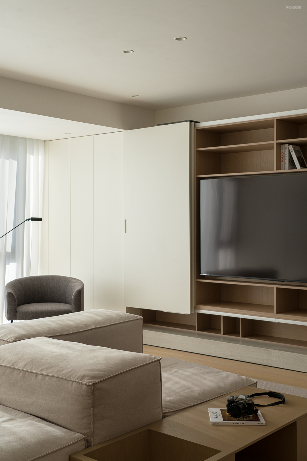 电视机柜采用巴士门设计,将娱乐和生活痕迹内藏,通过门的移动变化更多样的使用场景,极简内敛或自持温度,皆能收放自如。