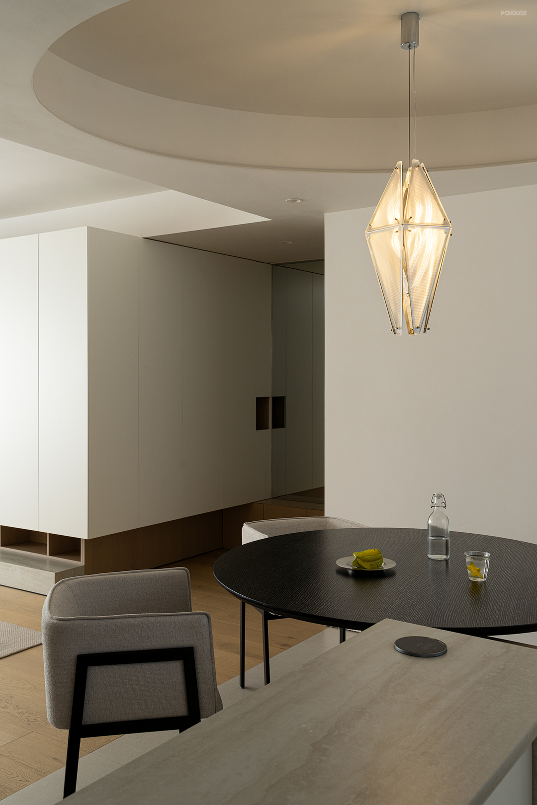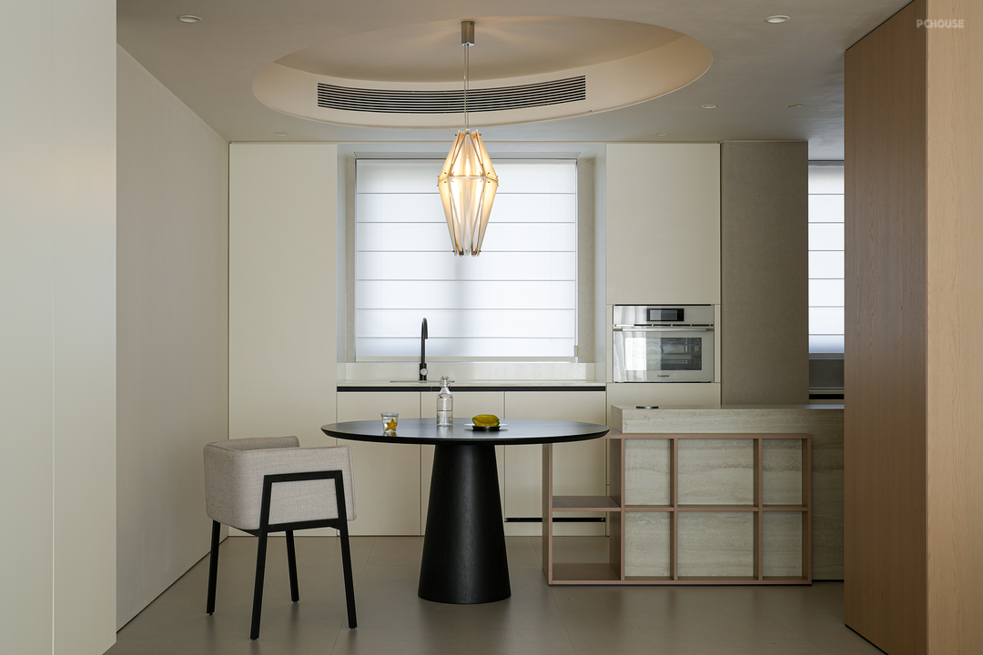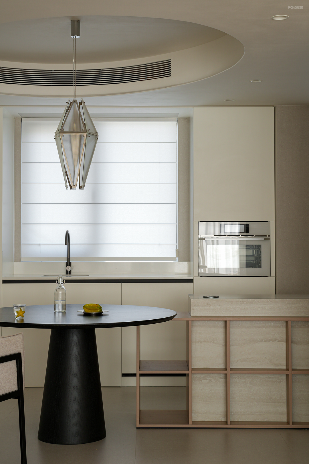 餐厅圆桌组合方形岛台,顺延带有先锋意识的极简线条,搭配金属、木作、石纹的整体生机。木格作为岛台的外框架,层次错落拼接,呈现多维度的几何应用。