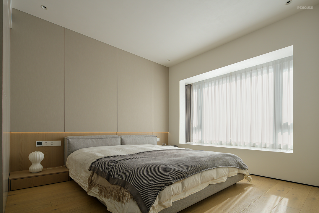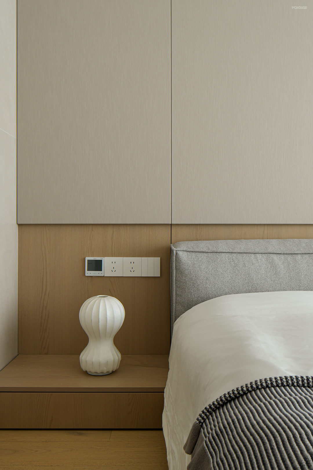 取消购买传统成品式家具,转而用精准的场景构建,定制床头柜、床架和饰面,均得到了舒适的嵌合。隐藏式灯带作为界限,切割出块面流畅的黄金比例,传达身心舒适的空间尺度。