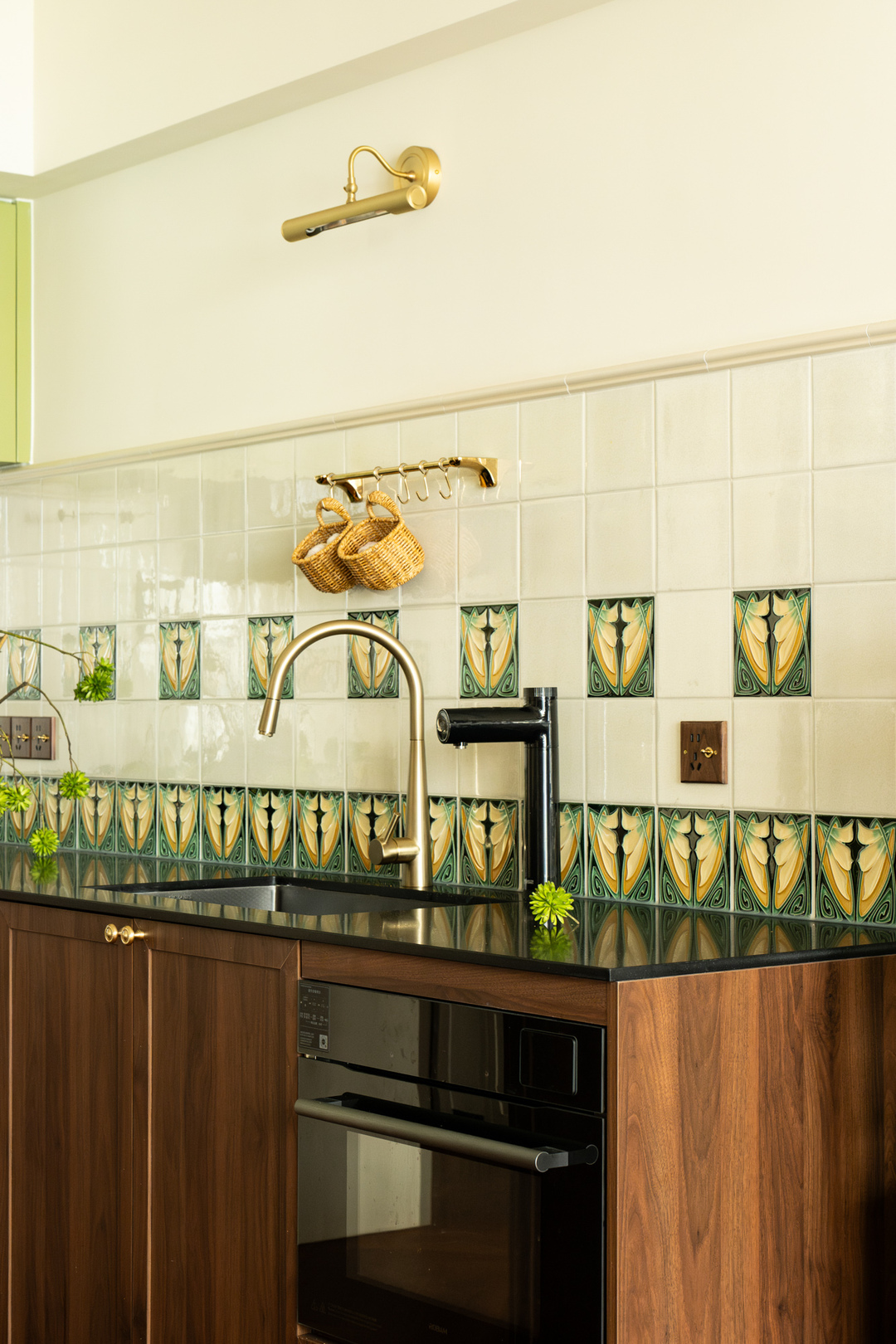 以手工珐琅砖点缀的L型开放式厨房,是茉莉中意的南洋风,绿色与胡桃木带着浓厚的热带气息,黄铜元素被运用在每一处细节之中,串联起同个空间中的两种风格元素。在这样一个极致利用的空间中,材质的协调运用与功能的流畅排布一样重要,能够让视觉与使用体验同时得到满足。