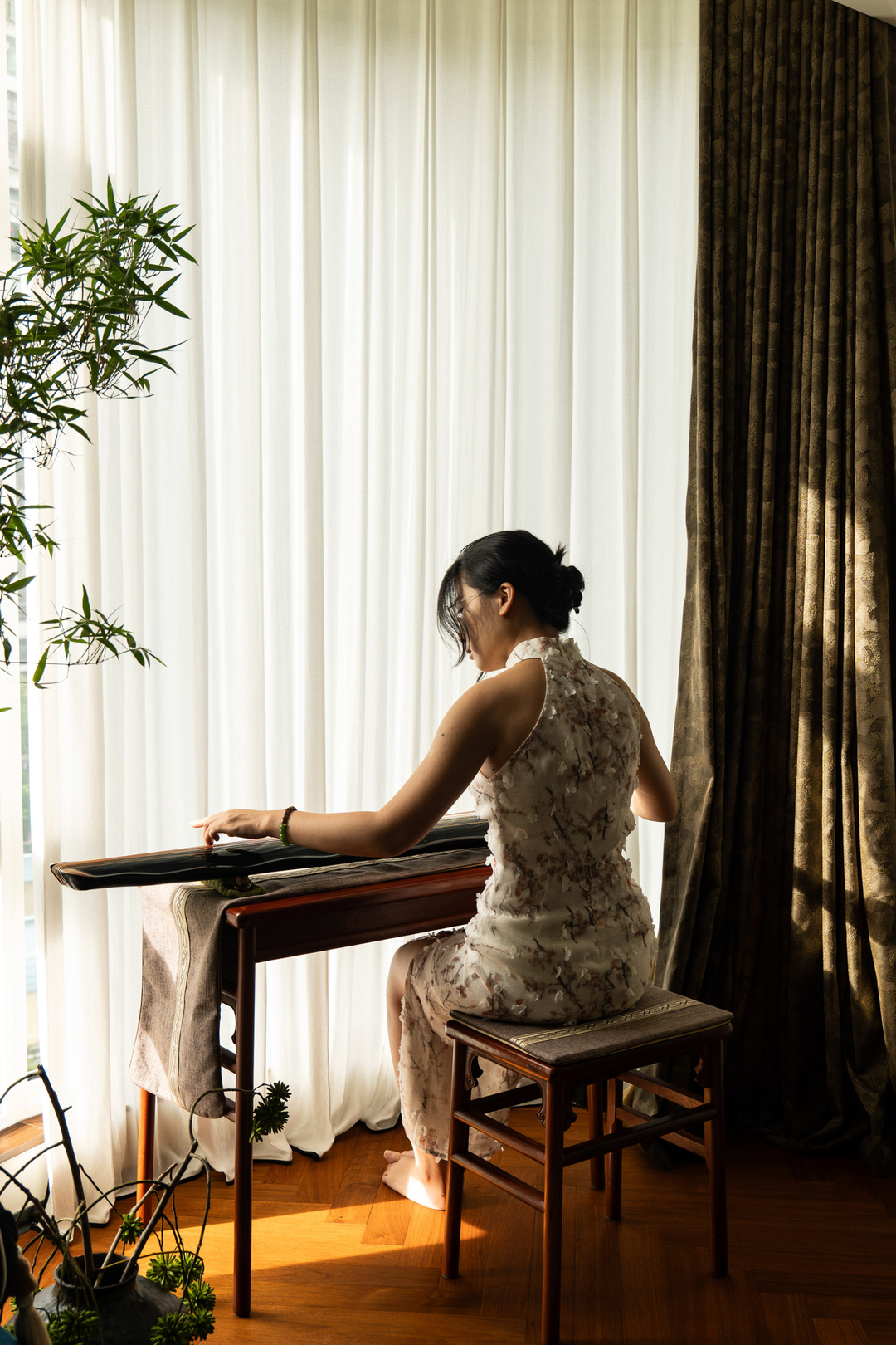 被纳入室内的阳台,补充了客厅的面积,也成为茉莉练习古琴的空间。日光下,薄纱朦胧,竹影摇曳,琴音清越。