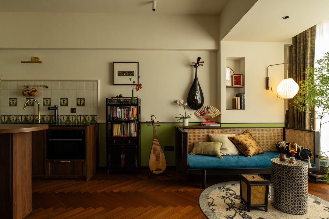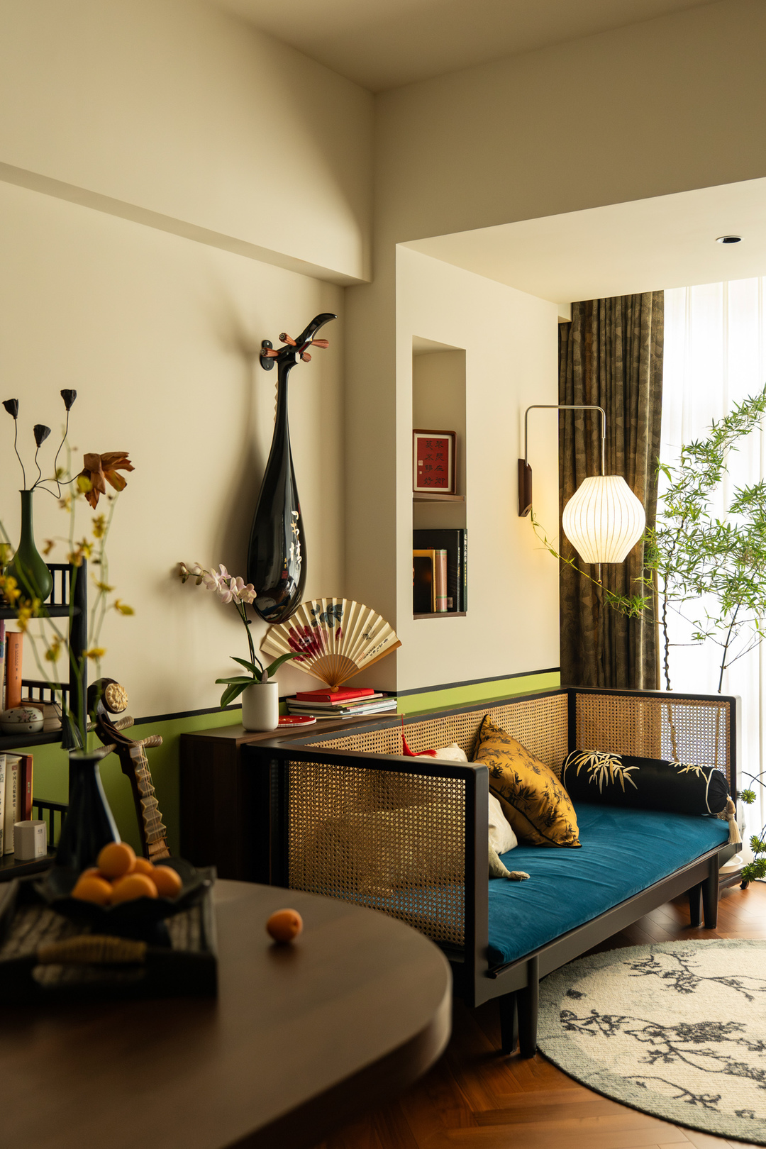 用带着新中式意趣的罗汉榻作为沙发,手工珐琅砖勾勒出家的腰线,琵琶既是乐器也是与空间相匹配的装饰。灯光下,竹影摇曳,温柔而松弛的氛围在家里蔓延开来。