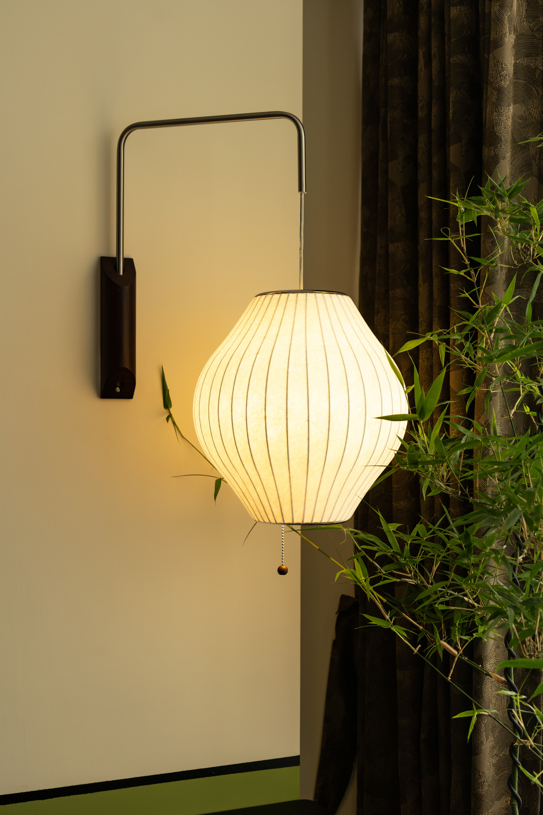 客厅的惬意来自于软装营造出的氛围。在设计师的计算下,一方罗汉榻与壁龛“恰好”化解了剪力墙无法拆除的突兀感,孔雀蓝软垫与藤编调和了硬朗的线条;形似灯笼的壁灯代替了客厅常用的落地灯,释放出地面空间;以贝母镶嵌的边几增加几分灵动。