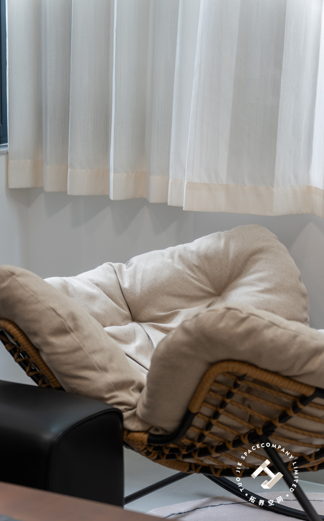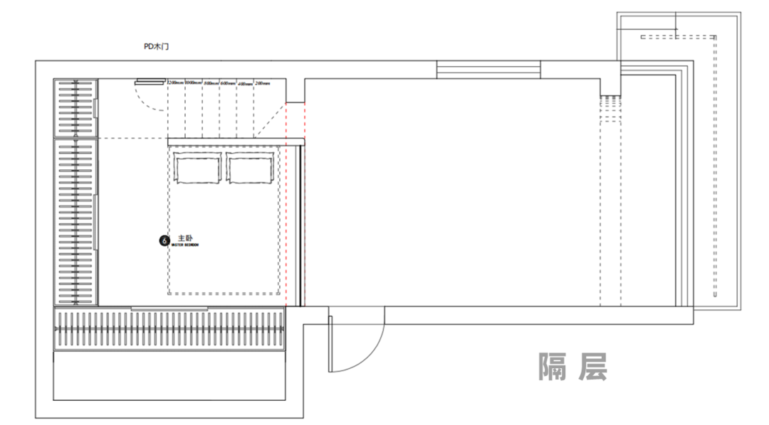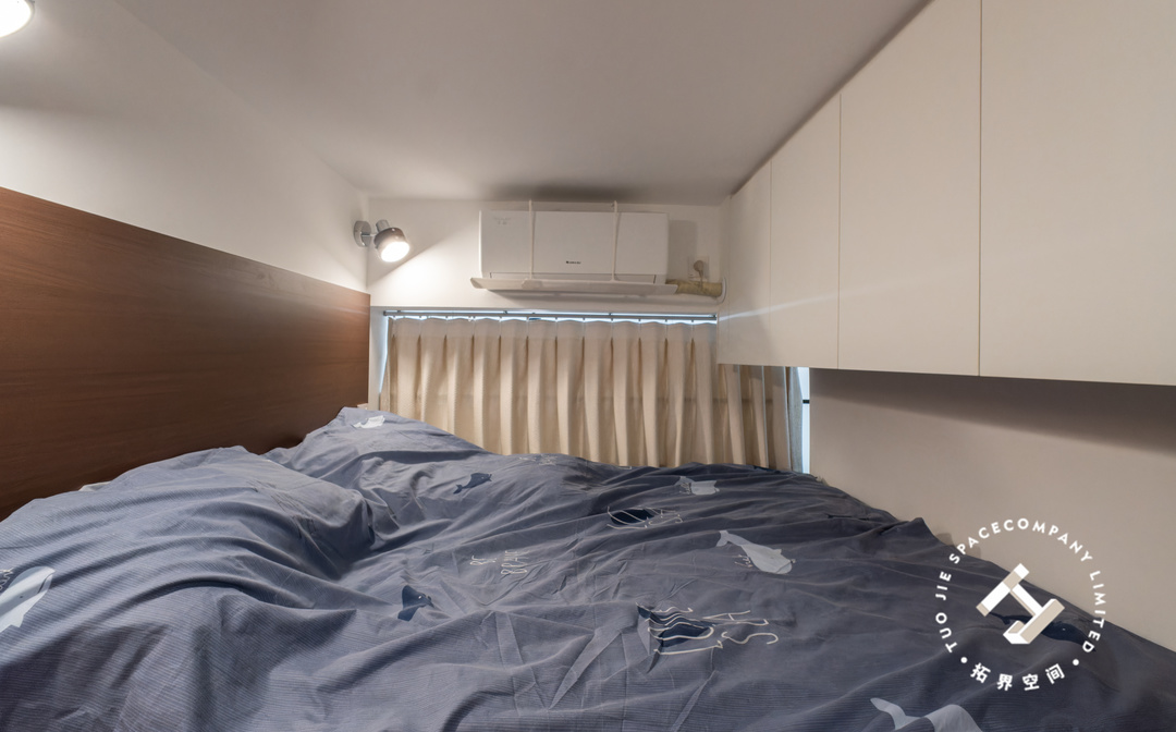 主卧位于上方的隔层,采用半围合+玻璃隔断,形成视觉通透的“悬浮式睡眠舱”,与一旁的镂空设计互相打配合,增添了几分轻盈灵动的气质。