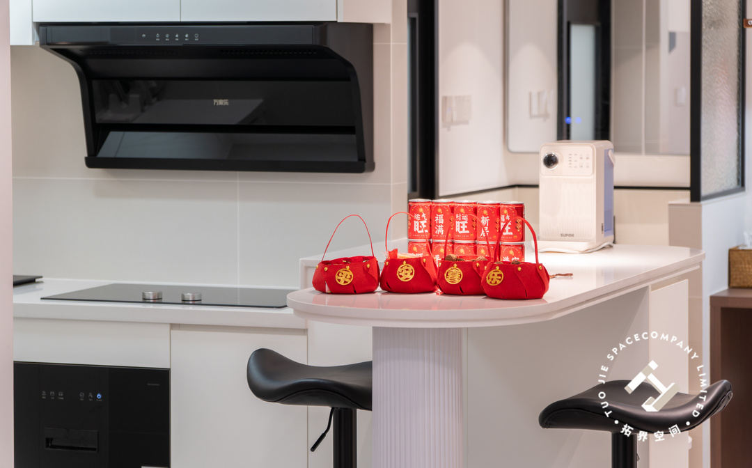 采用吧台替代传统餐桌,与开放式厨房形成流畅衔接,将空间利用率压榨到极致;吧台边角特意打磨成弧形,避免了磕碰风险,又以柔和的曲线为空间增添细腻感。