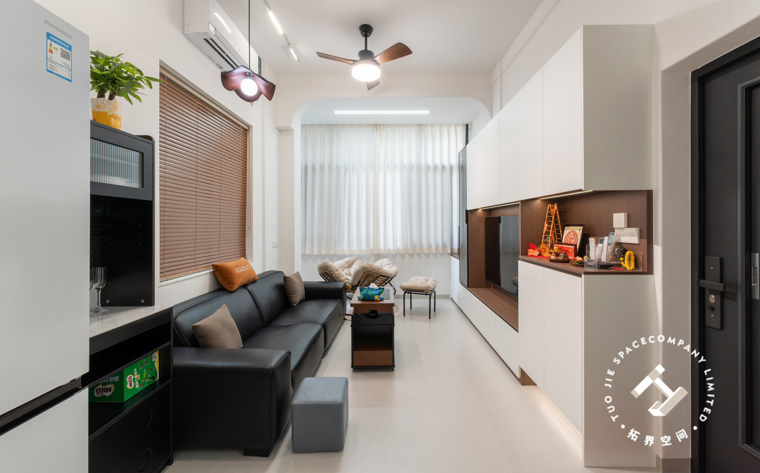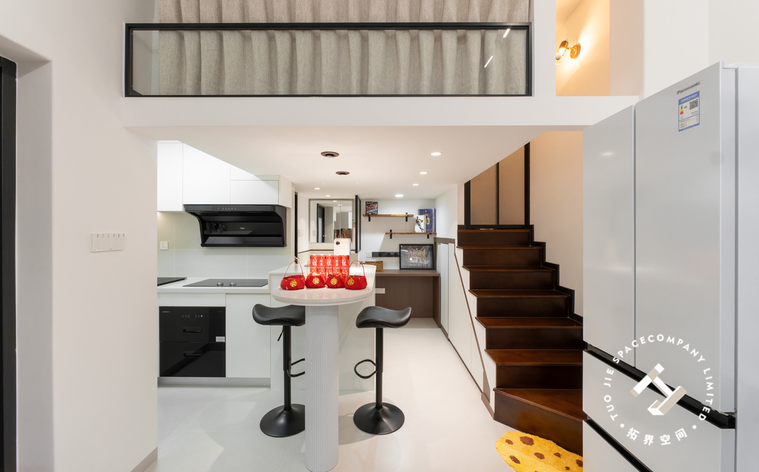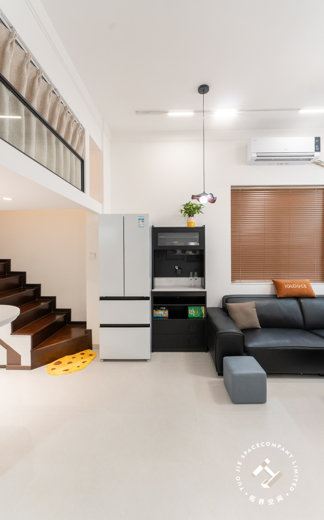 沙发与楼梯间的角落被巧妙利用,放置零食柜和冰箱填补空隙,上方搭配一盏别致的吊灯点缀,展现出实用与美观兼具的小角落。