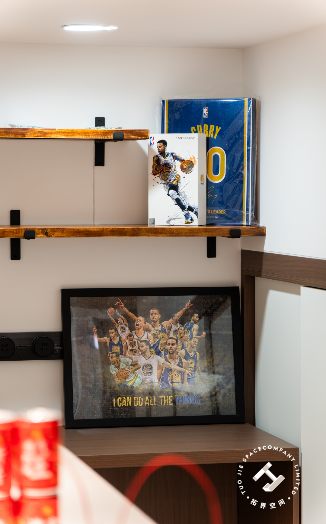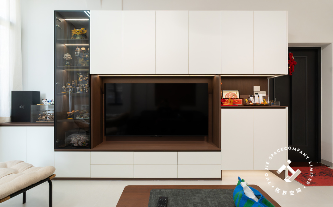白色与木色双拼的柜体,简约又不失温暖质感,左侧的玻璃展示柜陈列业主喜欢的手办,在灯光的烘托下,增添了一份独特的精致感与生活气息。